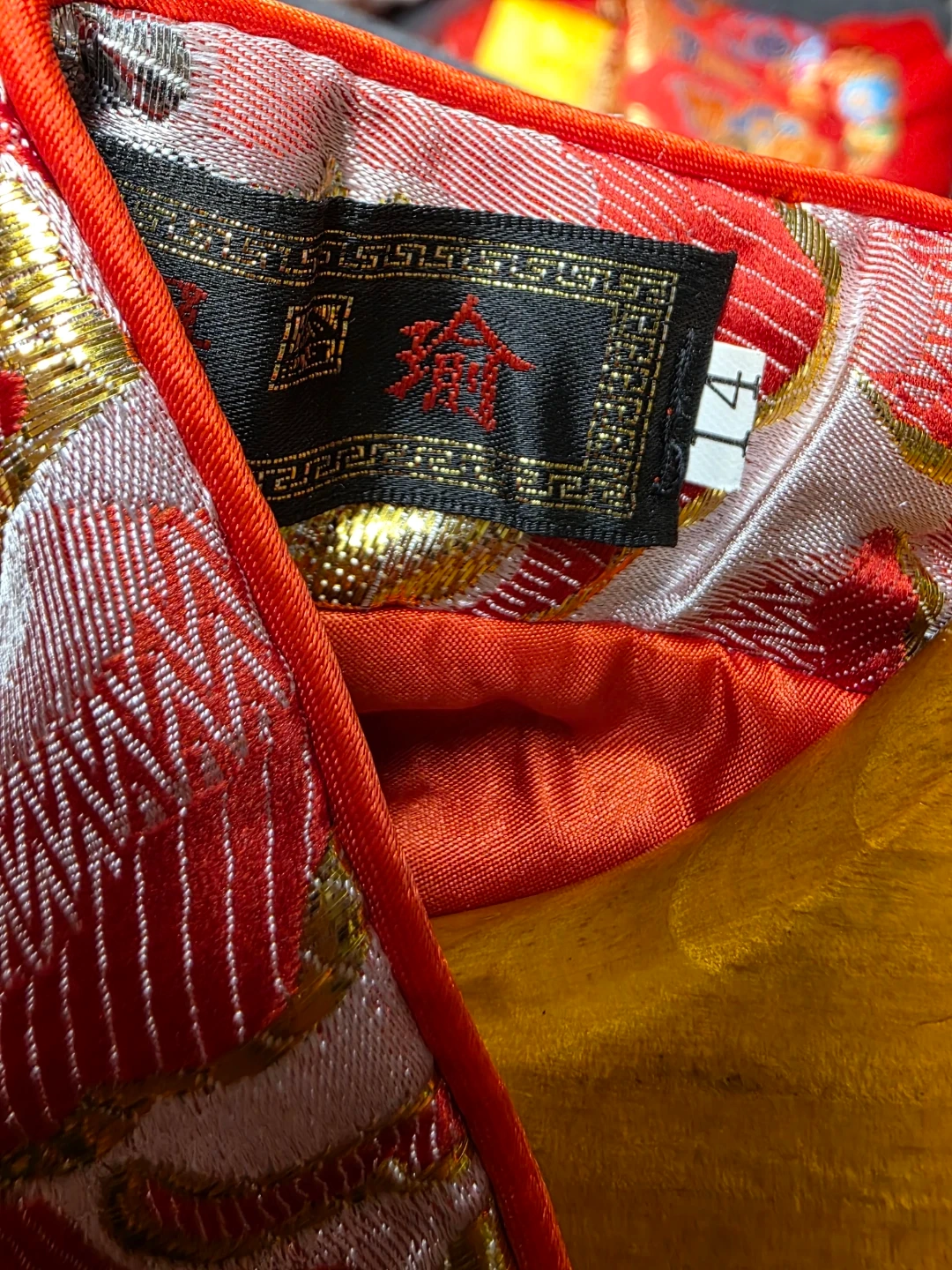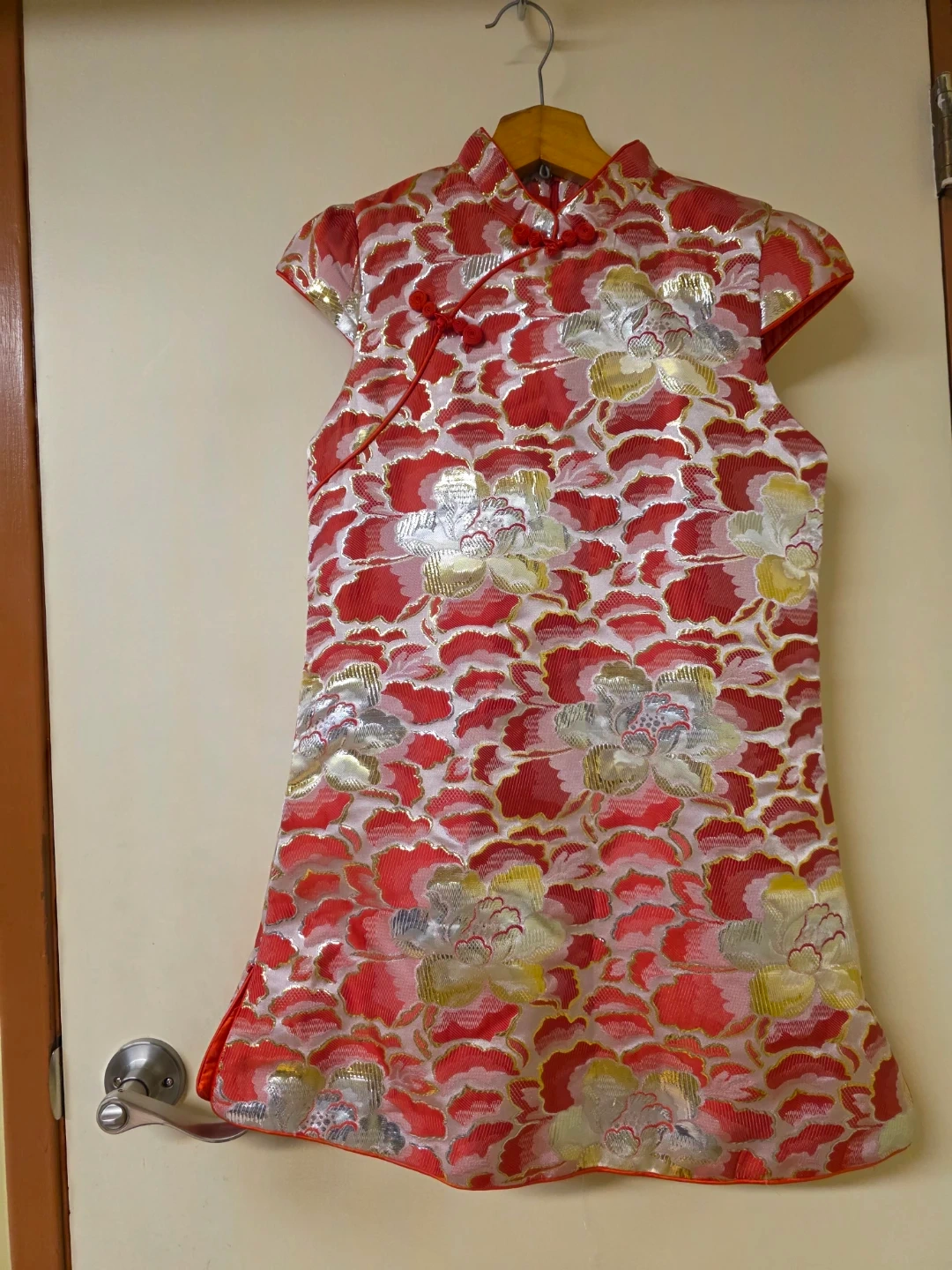 Vibrant dress for Chinese New Year! Has pretty red, gold, and silver floral pattern. Traditional cheongsam style with frog closures. Size 14 though fits a little smaller. Pick up by South Arm in Richmond.