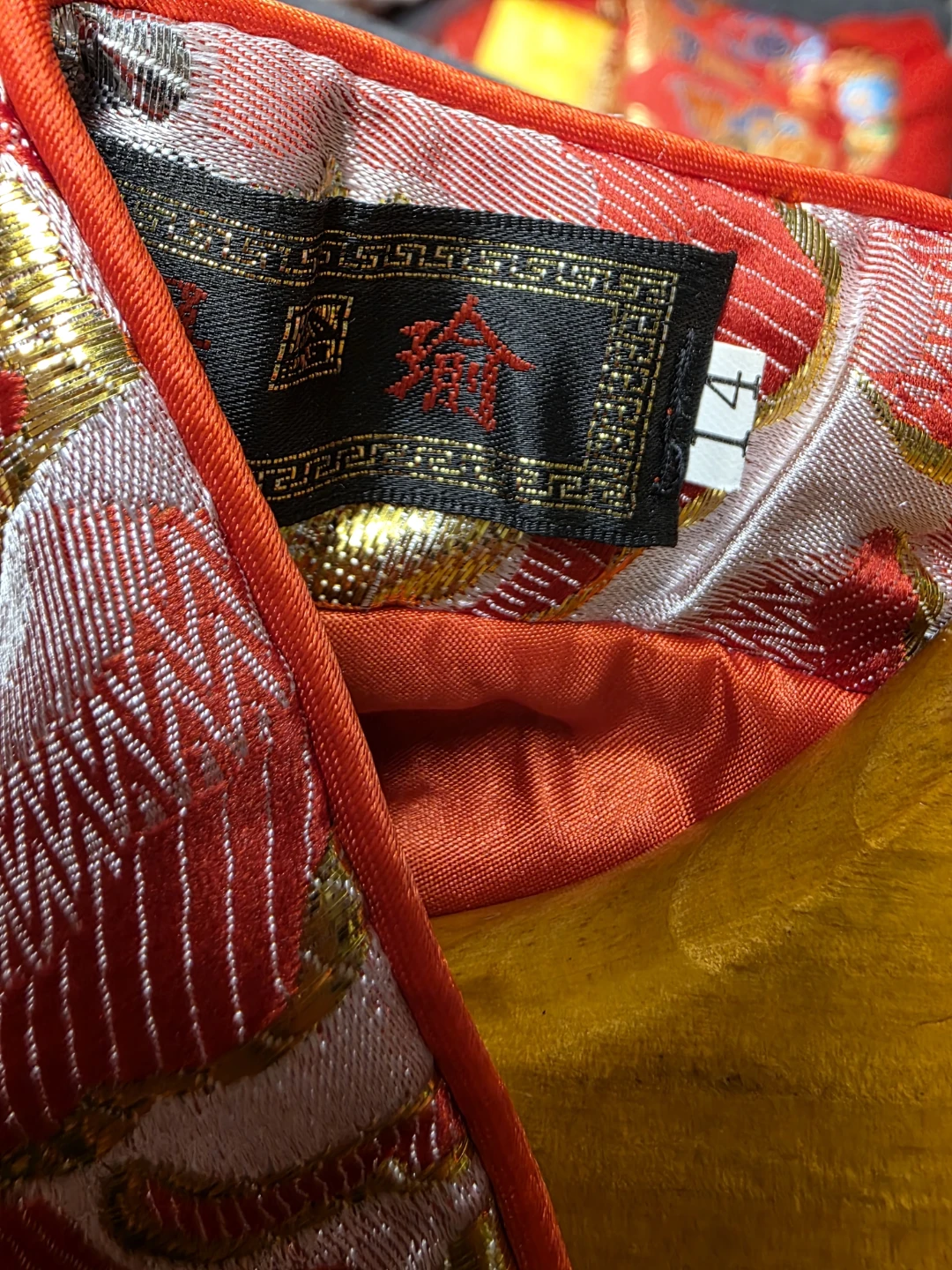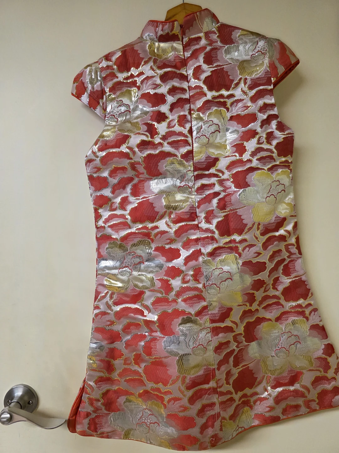 Vibrant dress for Chinese New Year! Has pretty red, gold, and silver floral pattern. Traditional cheongsam style with frog closures. Size 14 though fits a little smaller. Pick up by South Arm in Richmond.