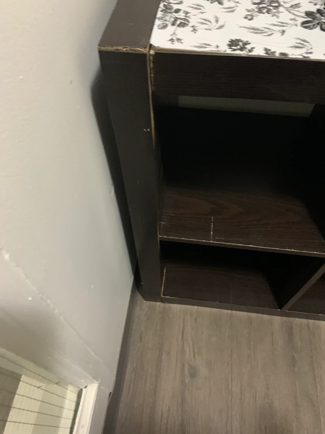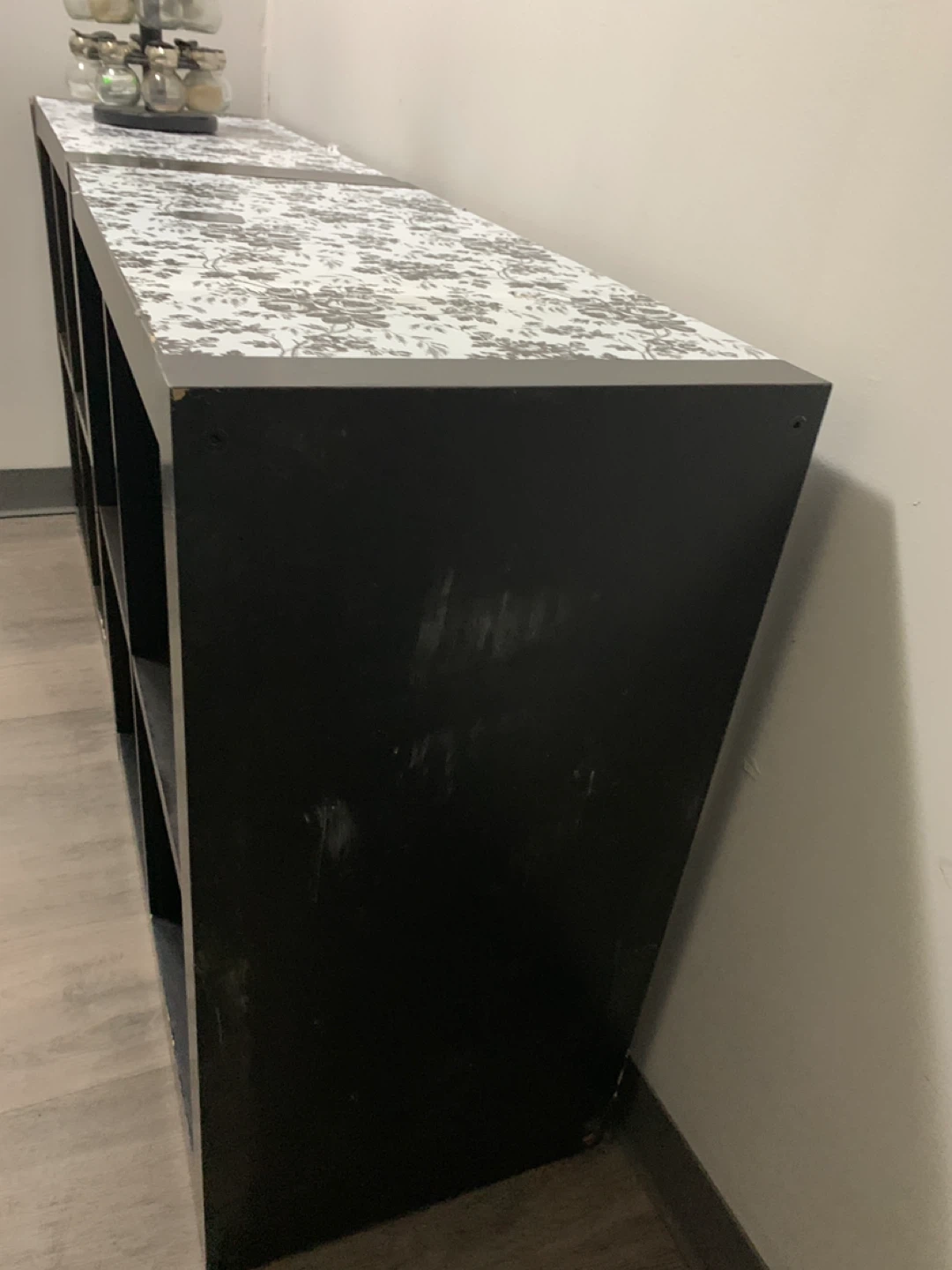 These are two IKEA KALLAX 8-cube organizers. They have a decorative white floral paper on top surfaces. Some scuffs visible on sides. They're a dark brown wood-effect finish.