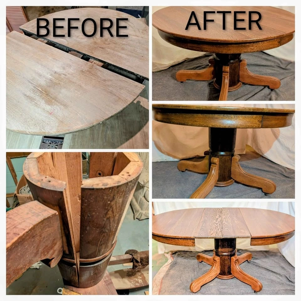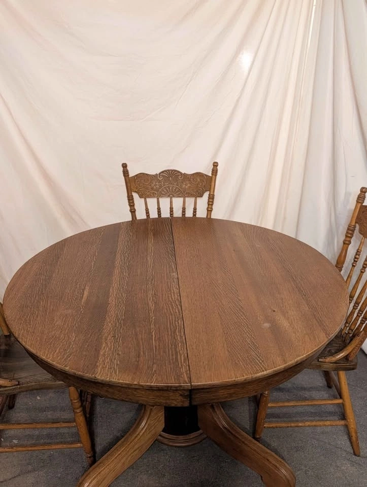 Restored Oak Pedestal Table: Featuring a gorgeous "tiger" grain top that has been stripped and refinished for a smooth, durable surface.