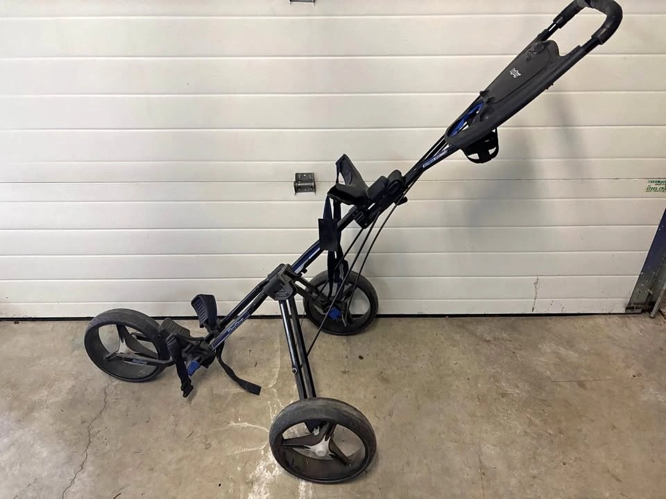 BAG BOY EXPRESS 240. Strong Aluminum frame for durability. Adjustable handle height. Effortless pushing. Quick fold & unfold. High Strength adjustable bag bracket & strap. Hand operated parking brake. Integrated beverage, scorecard, pen & ball holder.