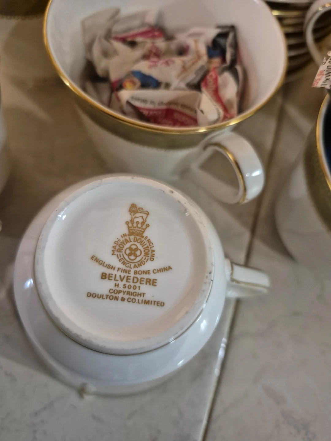 This elegant tea set is made of English fine bone china by Royal Doulton. It features the Belvedere pattern with gold trim. It's perfect for serving tea or coffee at special occasions.