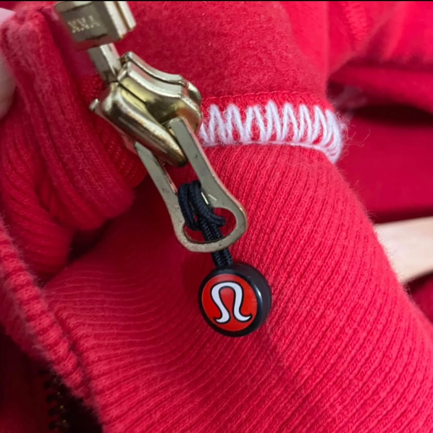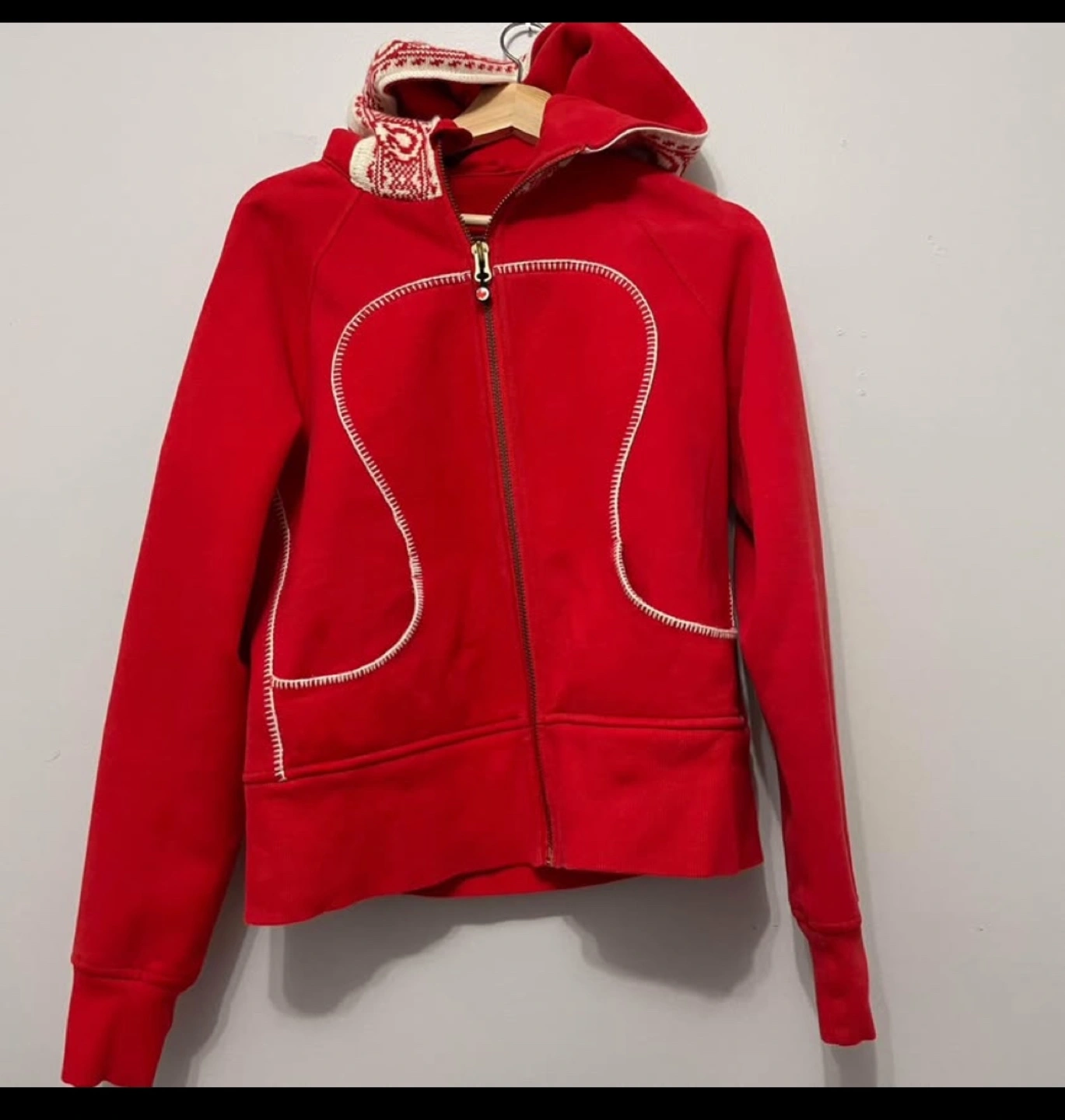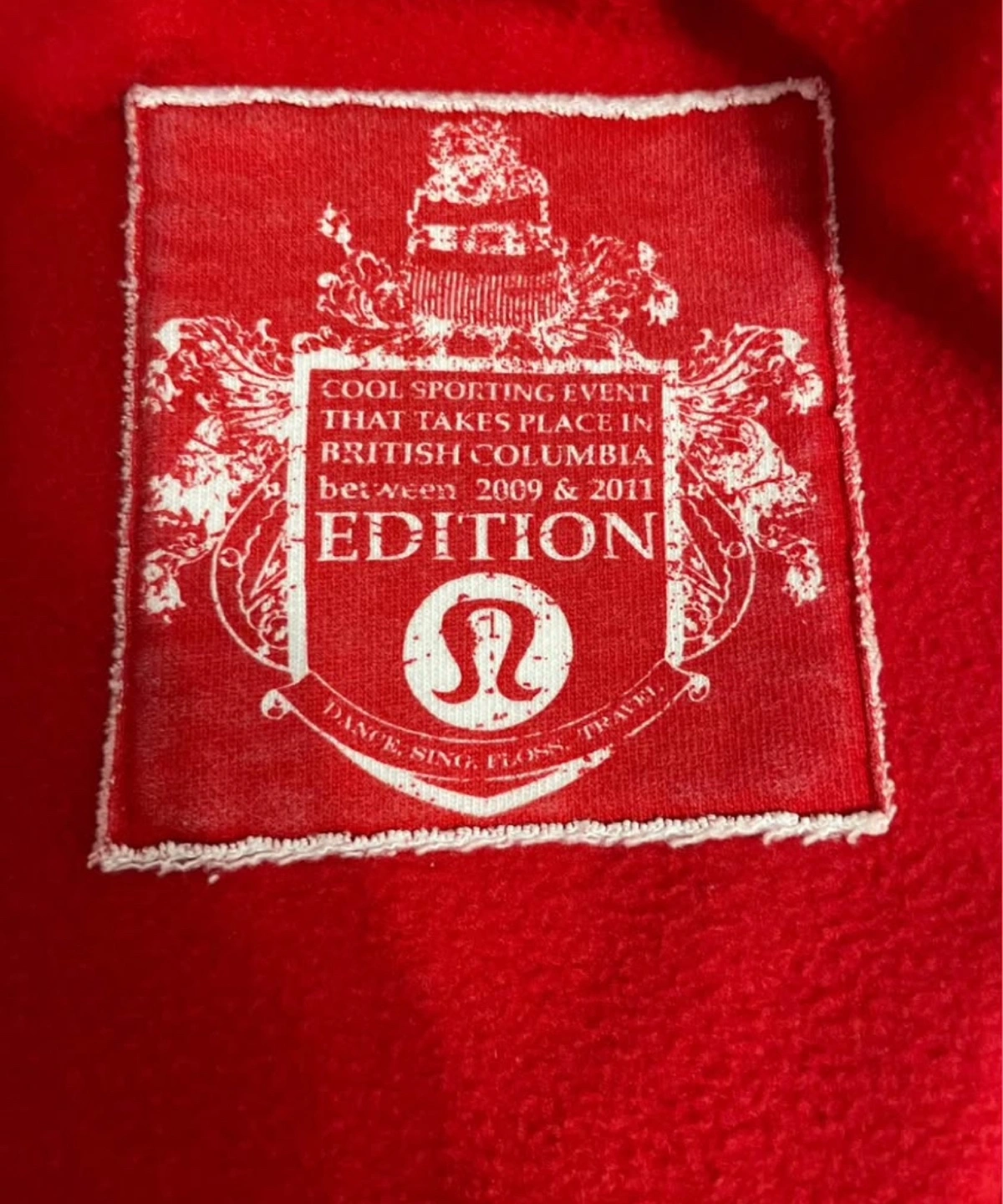 Red Lululemon hoodie with white trim and a knit hood. Features a white patch on the front with the words "Cool Sporting Event That Takes Place in British Columbia Between 2009 & 2011 Edition".