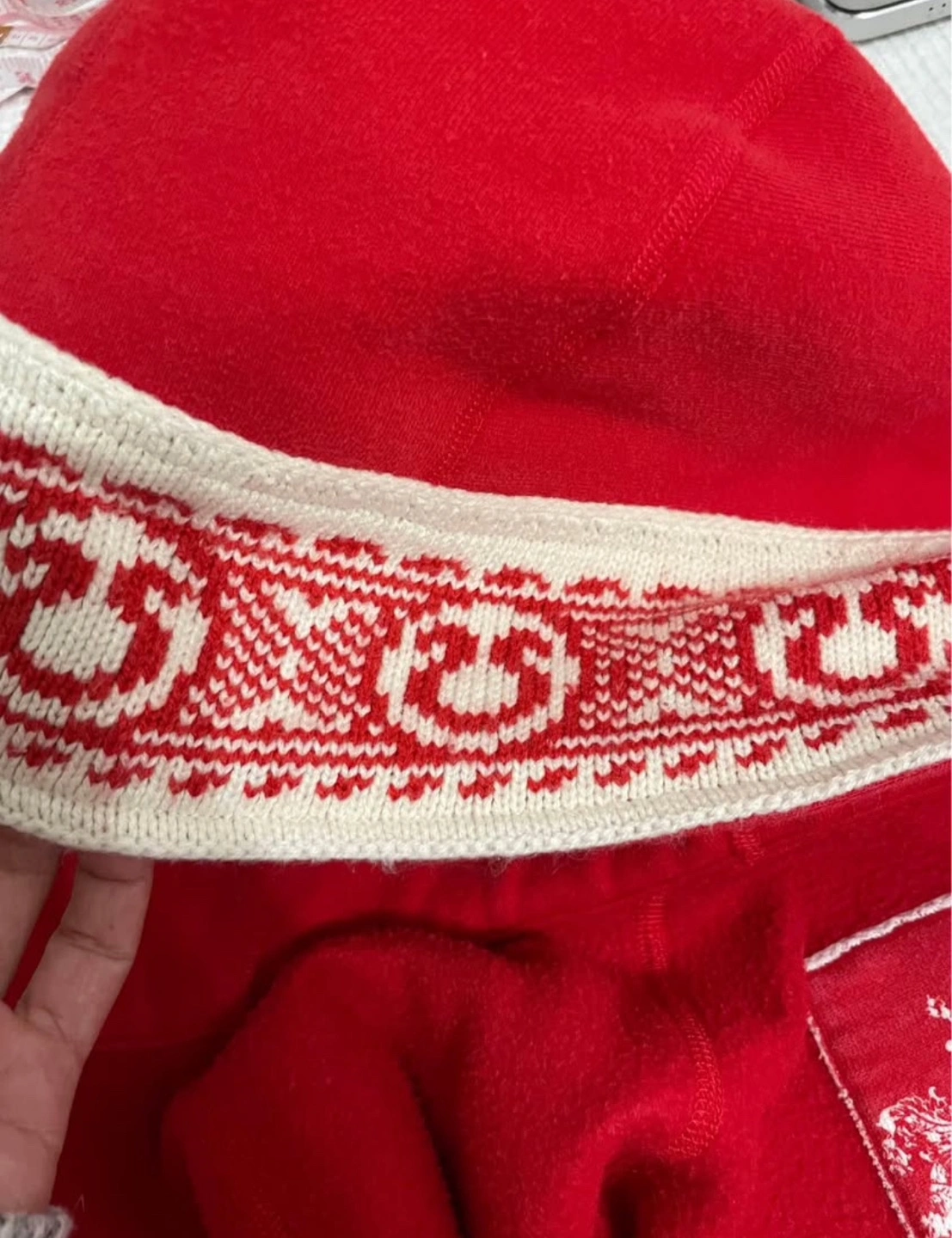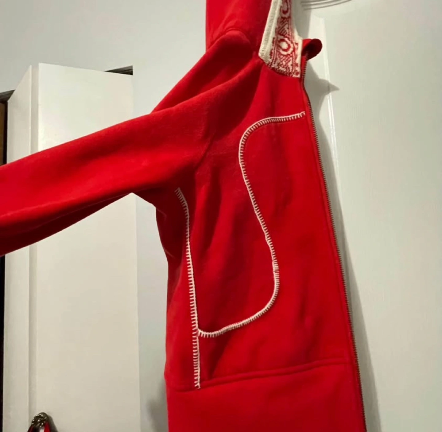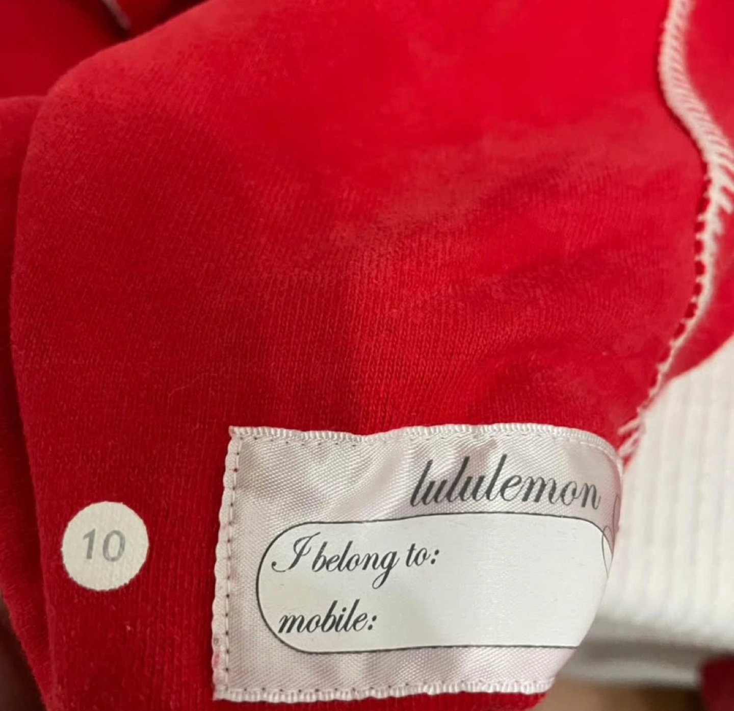 Red Lululemon hoodie with white trim and a knit hood. Features a white patch on the front with the words "Cool Sporting Event That Takes Place in British Columbia Between 2009 & 2011 Edition".