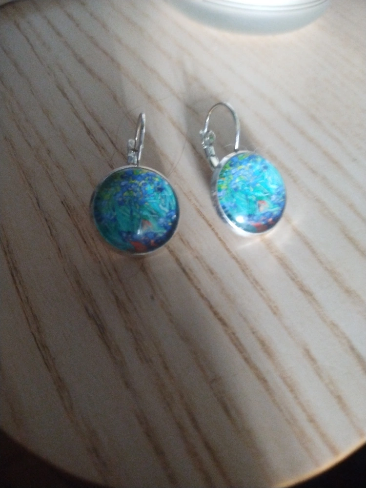 1000+Silver earrings with a blue and green glass design. Hook style closures.