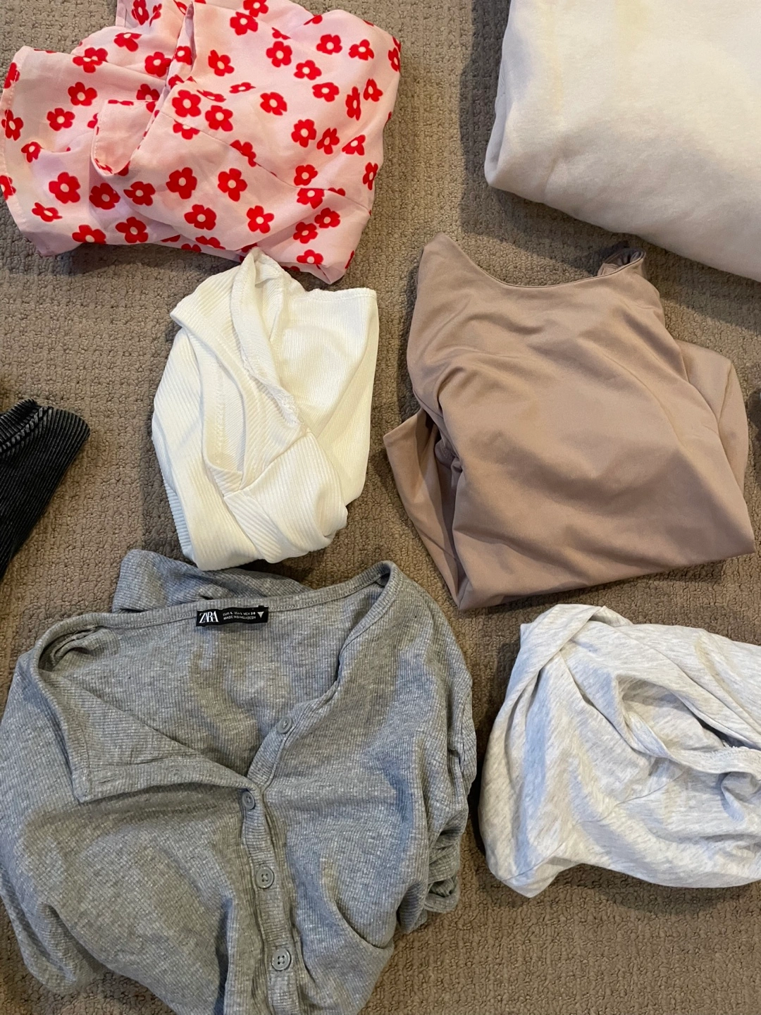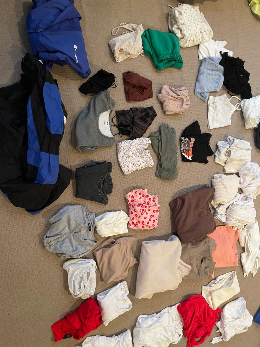 Various colours and styles, includes some sweaters and a few pairs of pants.