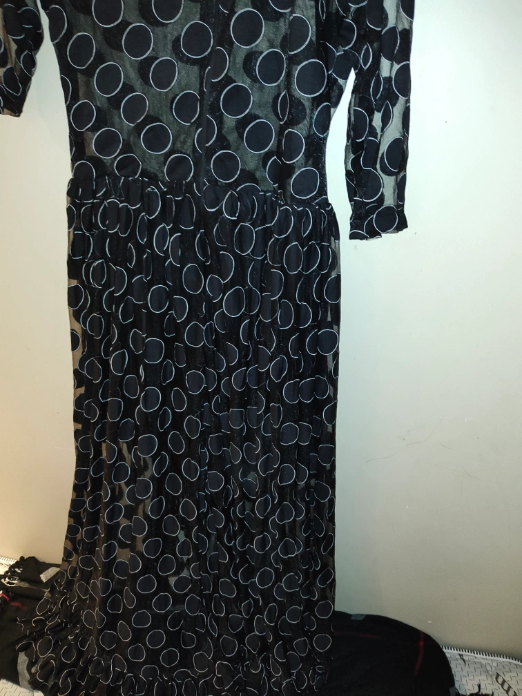 Black mesh dress with white polka dots. The dress is knee-length with a scoop neckline. The dress has 3/4 sleeves and a slightly gathered skirt.
