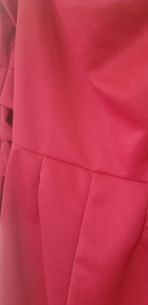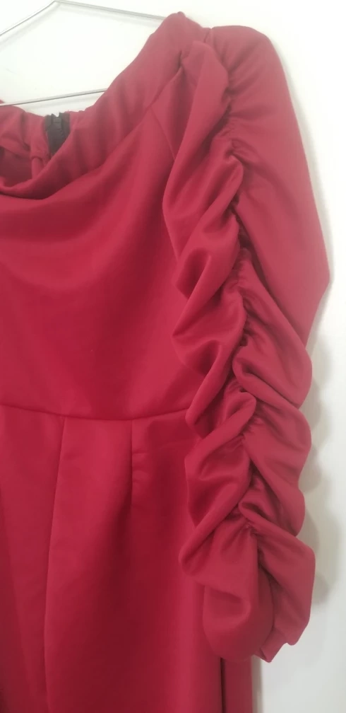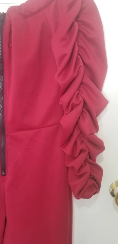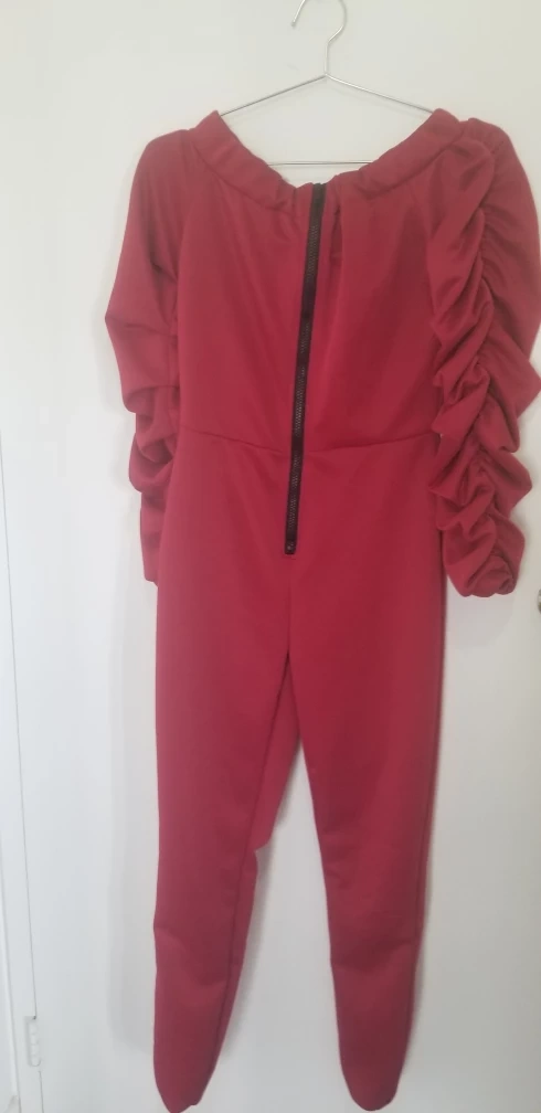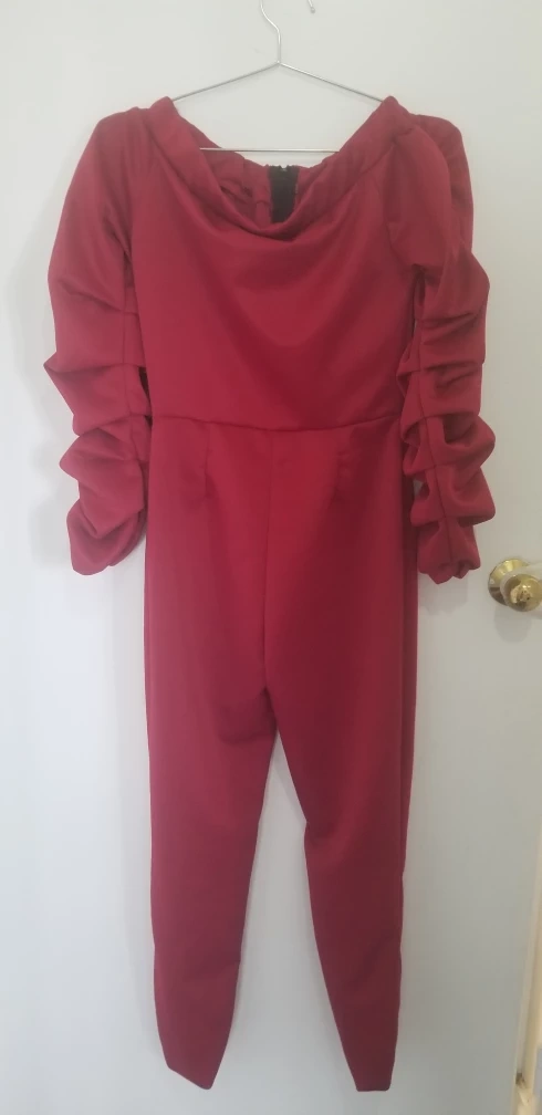 94Red off the shoulder jumpsuit with long, ruffled sleeves. Back zipper closure.