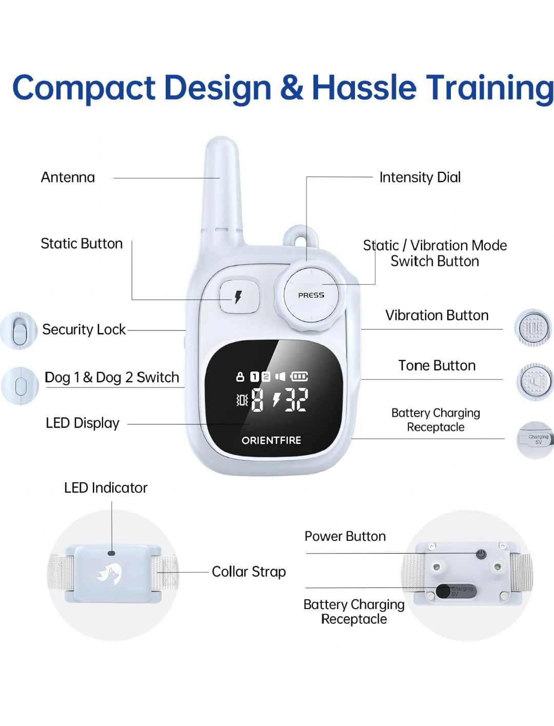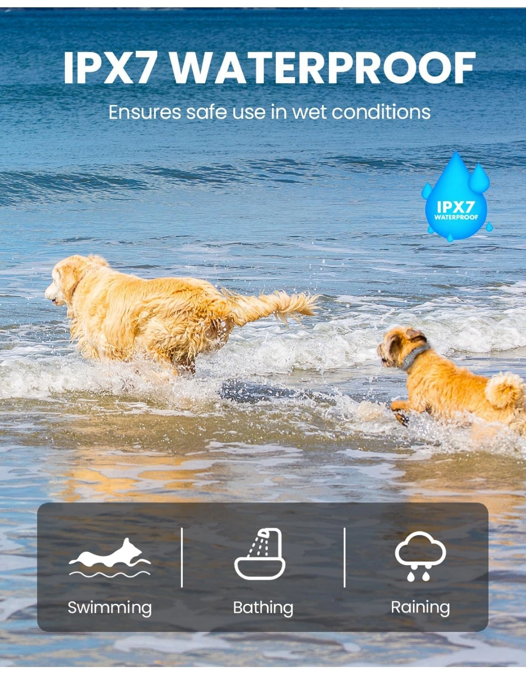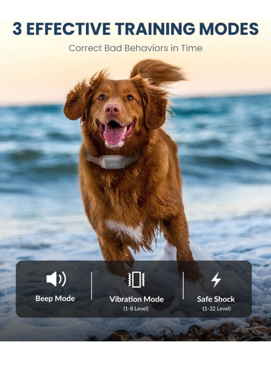 Waterproof, rechargeable, and adjustable for all sizes. 3 training modes: Beep, Vibration and Safe Shock. 2000 ft range.