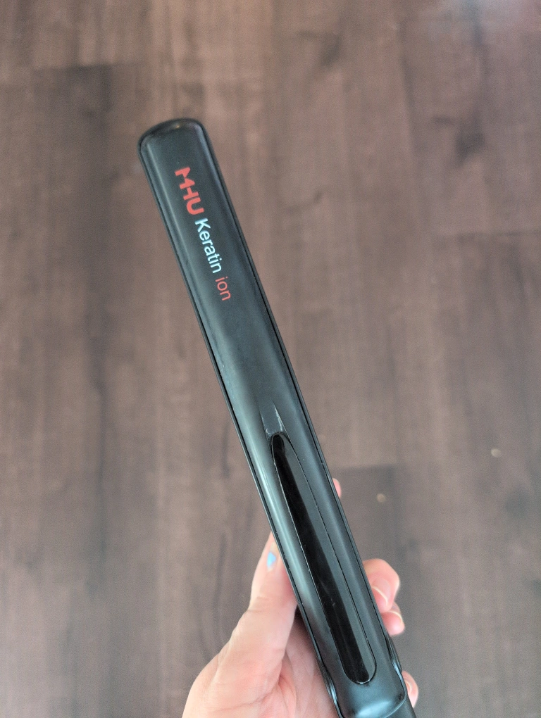 Black hair straightener. MHU Keratin Ion. Has a temperature control dial and an on/off button.