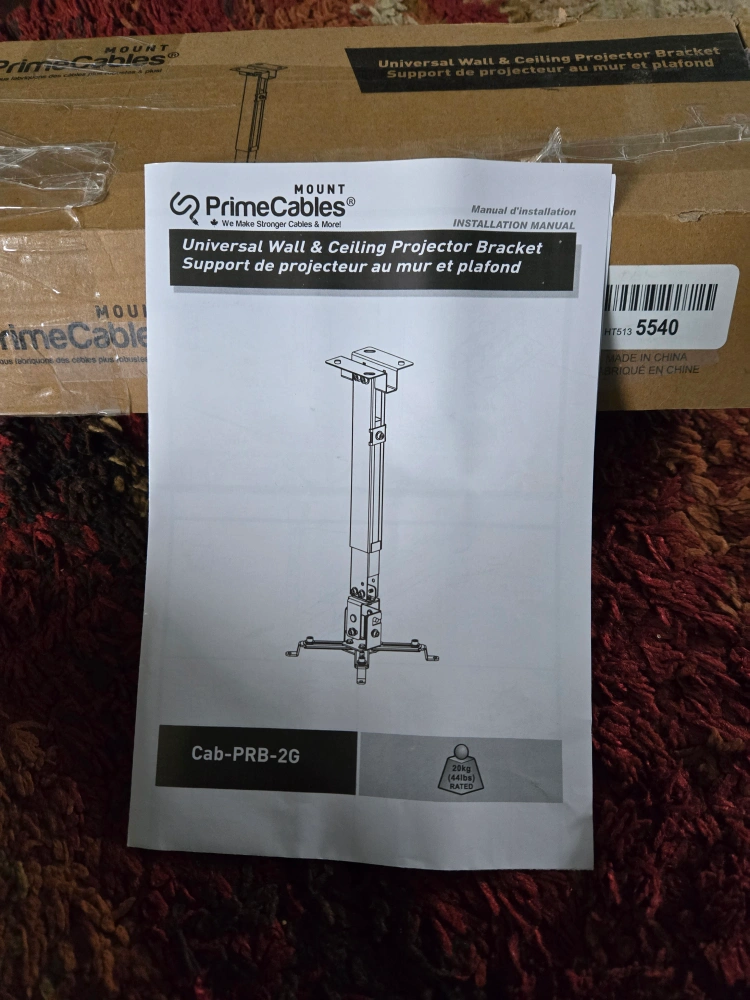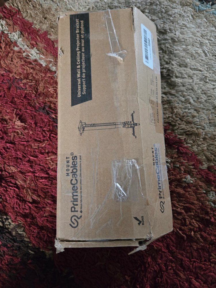 Universal wall and ceiling projector bracket, new in box. Includes instructions and mounting hardware.