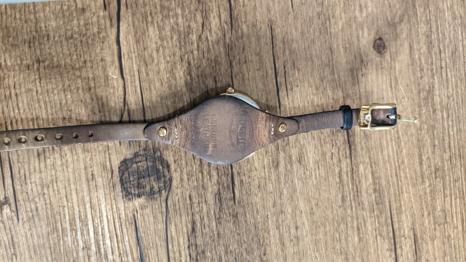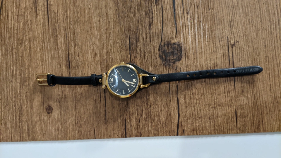 Gold-tone watch with black face and black leather band. minor scratch shown in photo