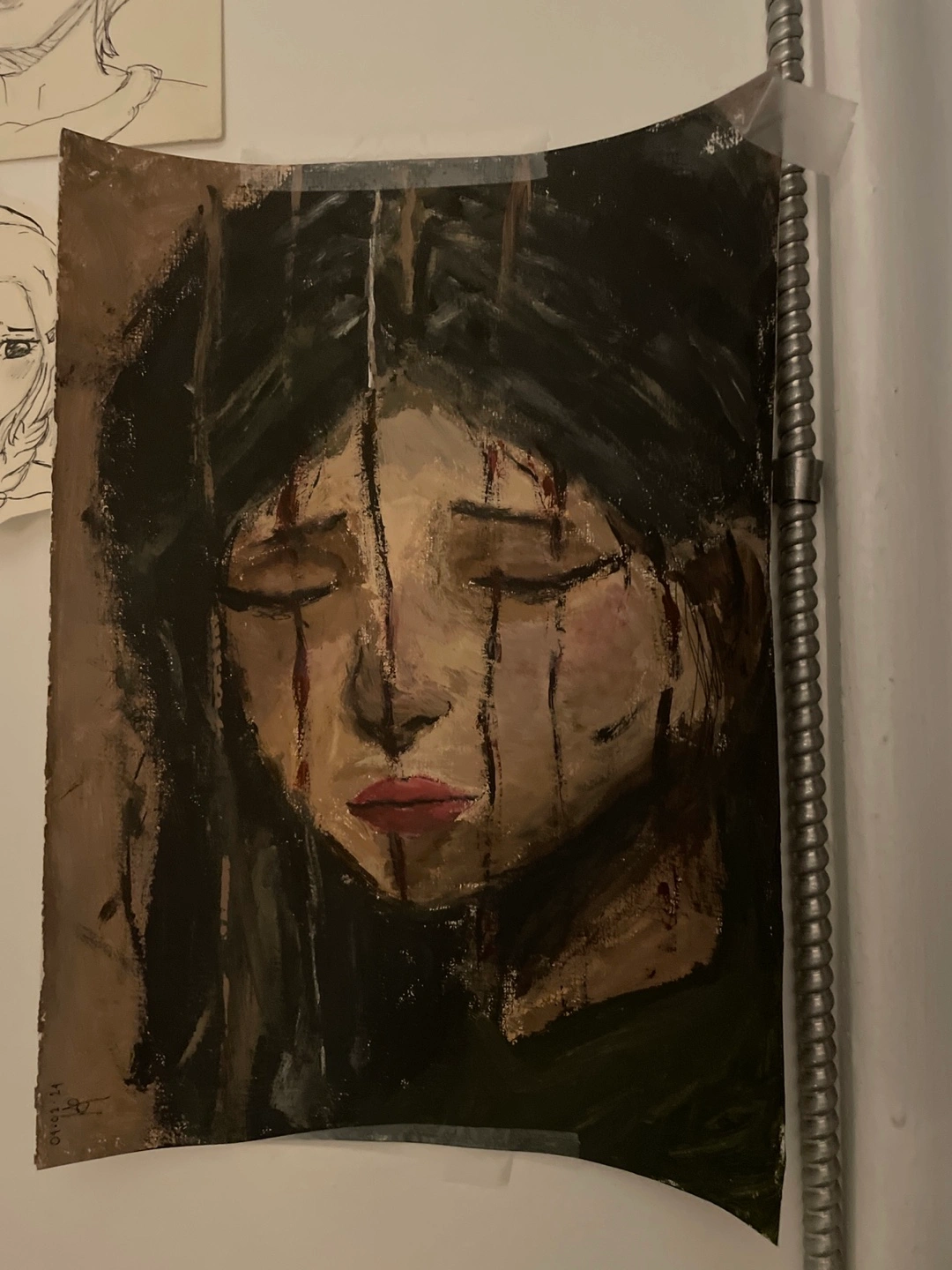 Original painting of a woman's face with closed eyes. Painted with acrylics on paper. The artwork is signed in the bottom right corner. The piece is 11.5x14 inches.