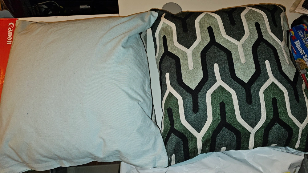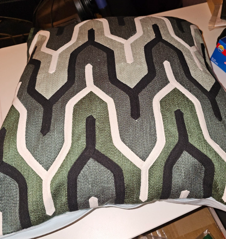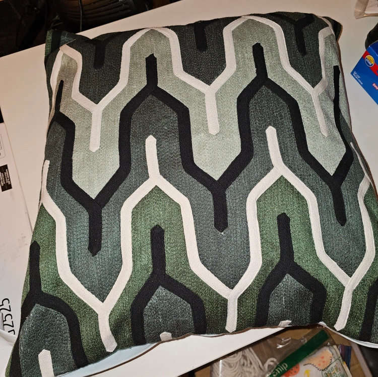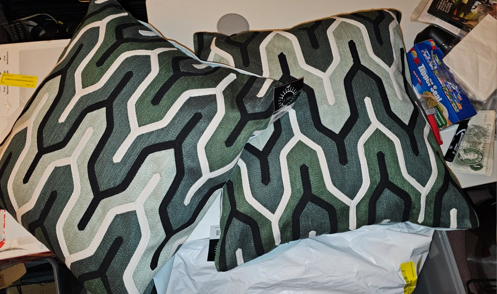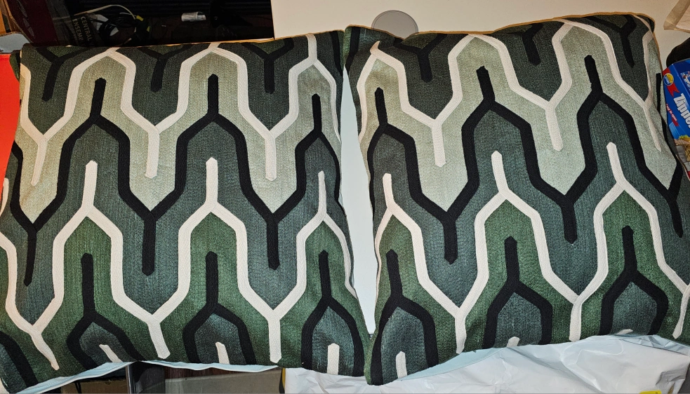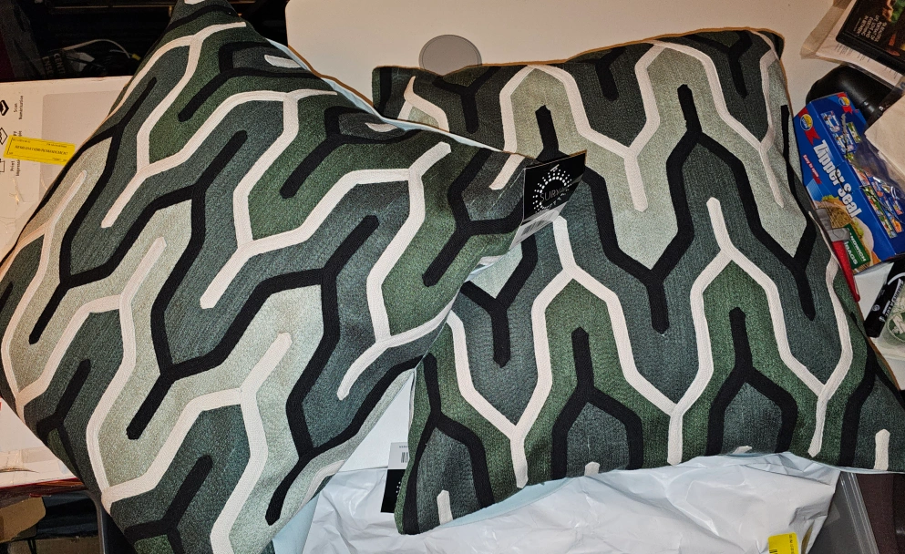 Set of two decorative pillows with a geometric pattern. Green, white, black & gray. 20" x 20"