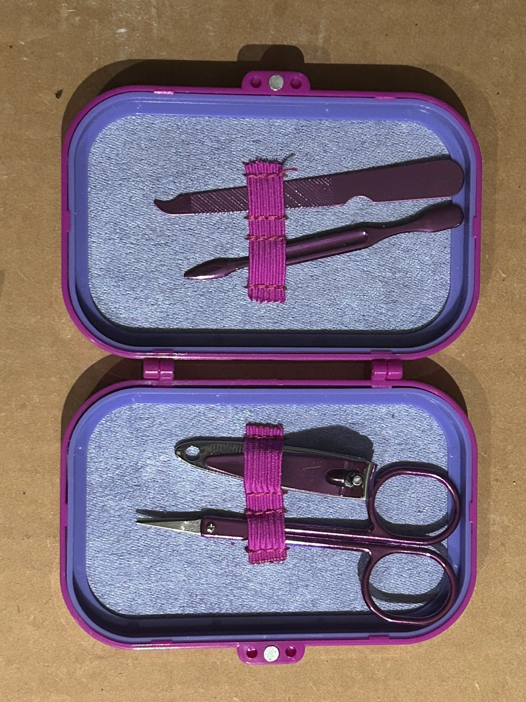 Purple travel manicure set, includes nail clippers, tweezers, nail file and cuticle pusher. Comes in a compact purple case. Moving sale. See my other items. Pick up in Rundle, NE Calgary. If listed it is still available!