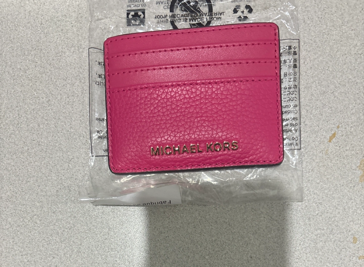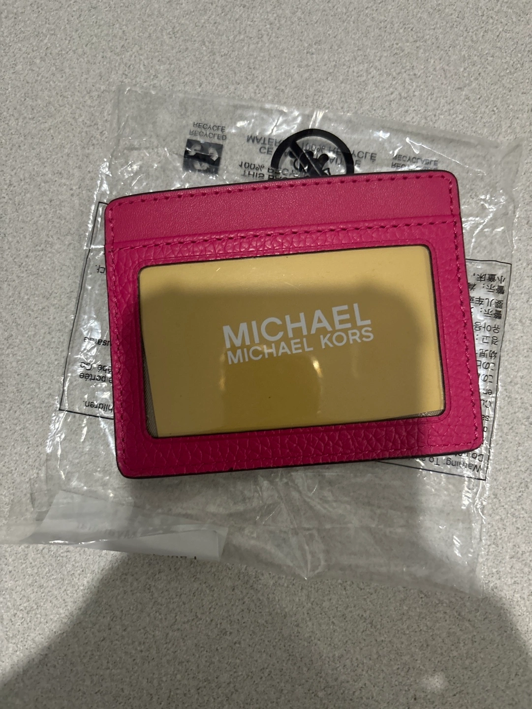 Pink leather card holder with a clear ID window. New with tags. No offers