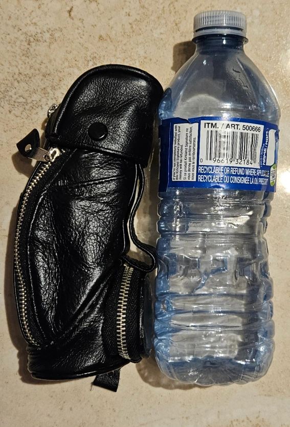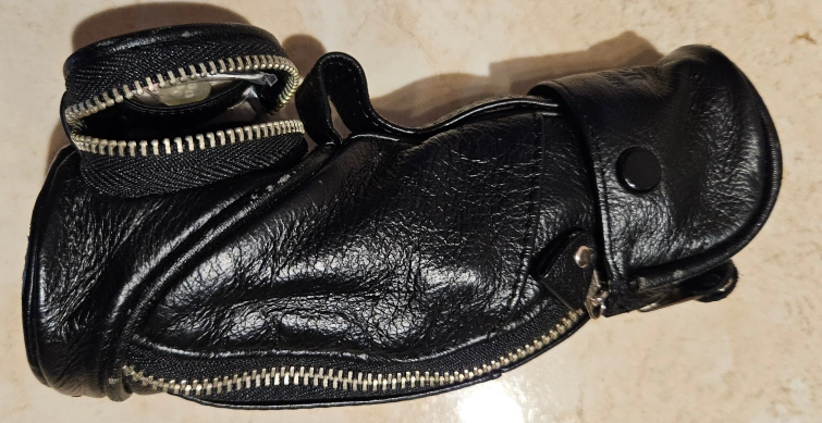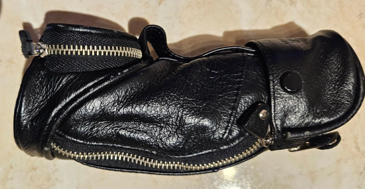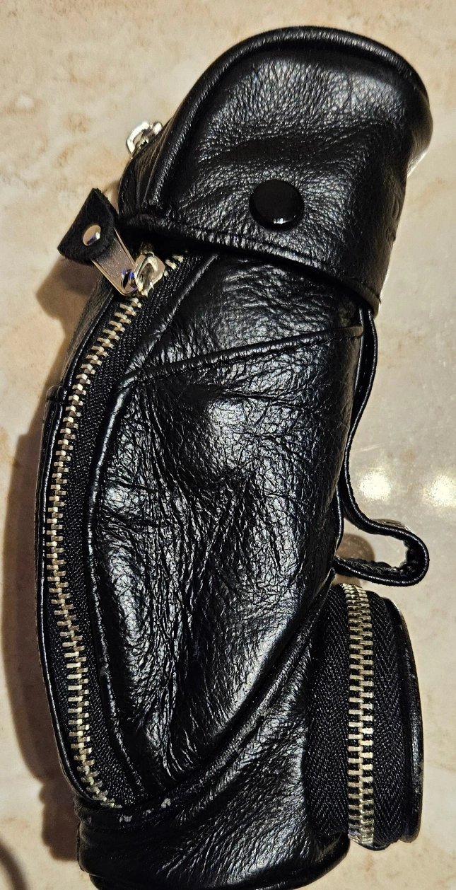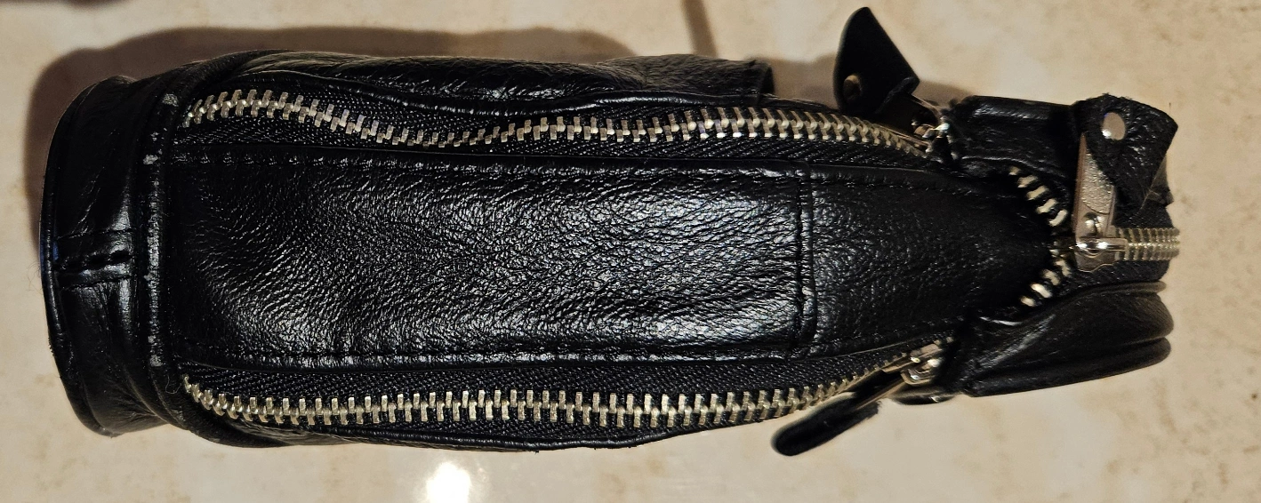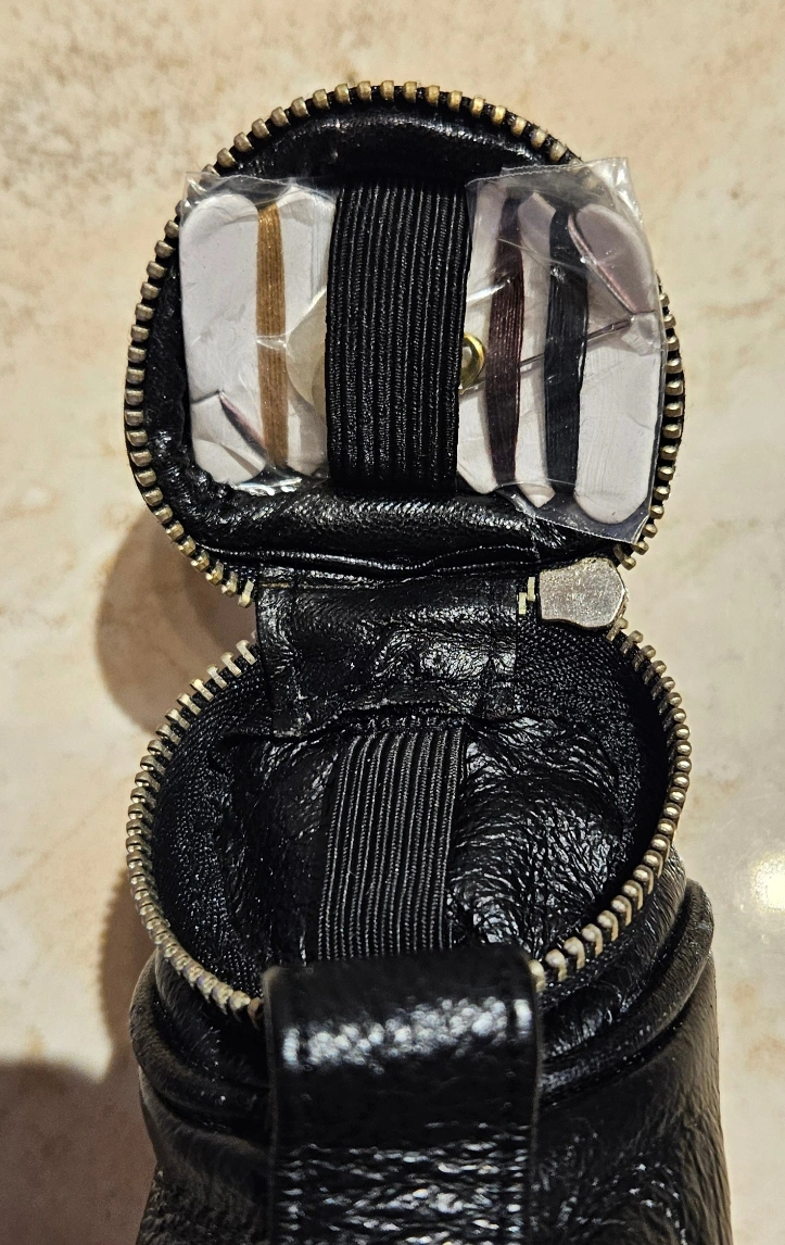 Black leather sewing kit with multiple zippered compartments. For a variety of sewing supplies including needles, thread and buttons.