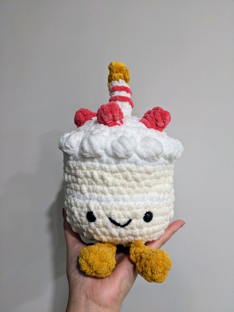 Cute crocheted cake plush toy with a happy face and yellow legs. It has a pink and white candle on top and a red frosting design.
