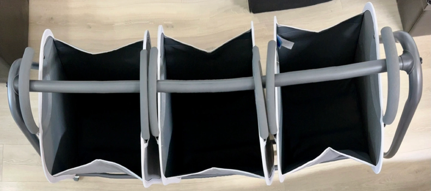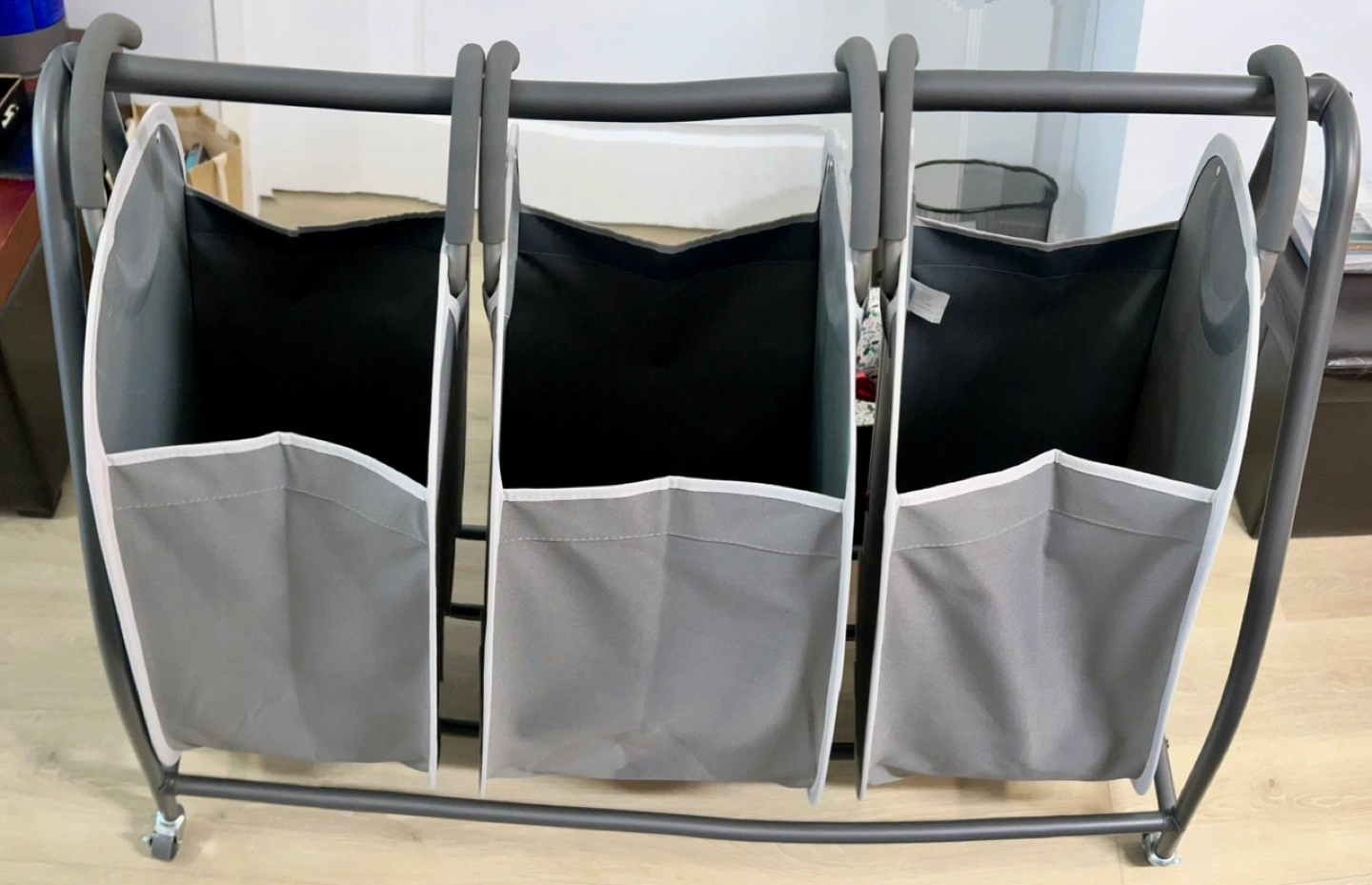 Rolling laundry hamper cart with 3 removable grey baskets. The frame is grey metal with wheels.