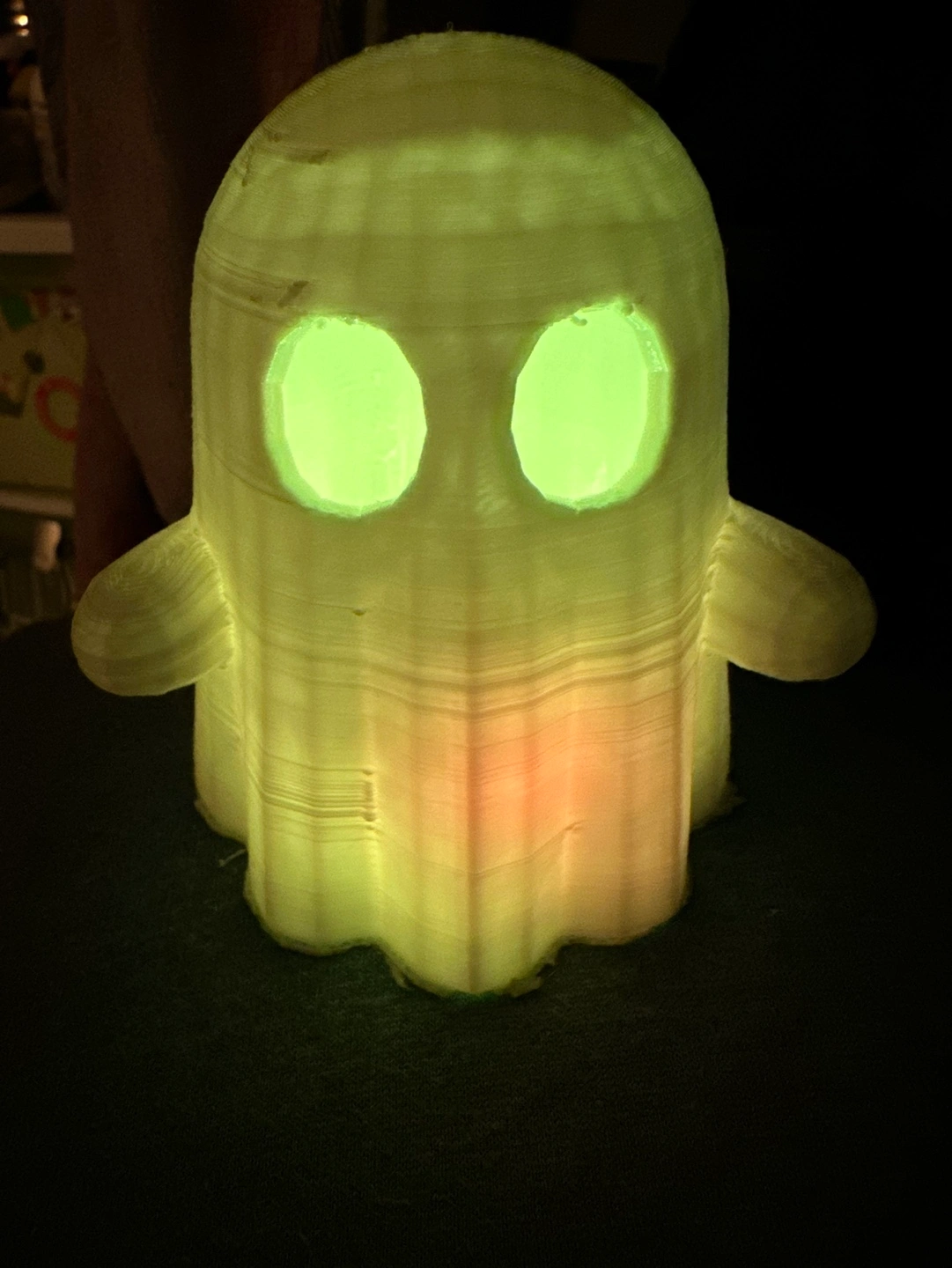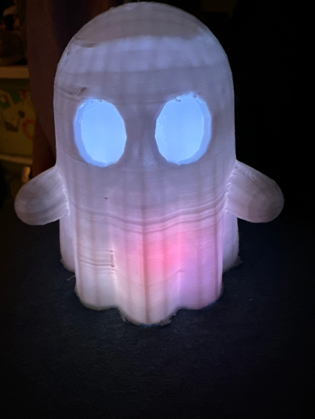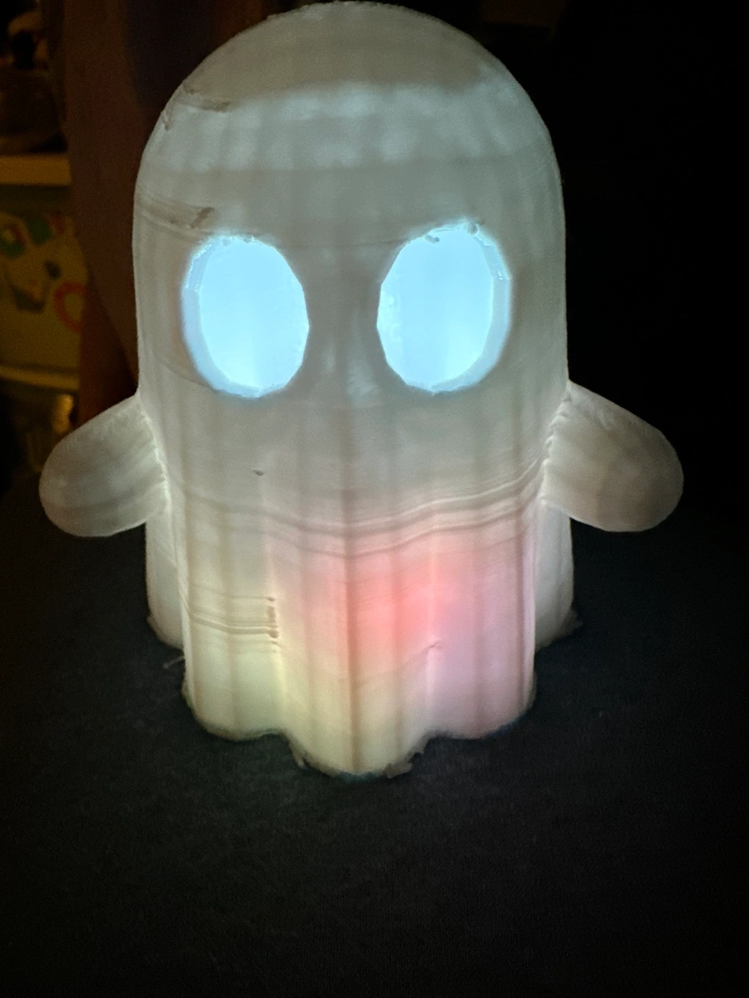 653D printed ghost with colour changing LED lights. Can be used for Halloween decorations or as a nightlight.
