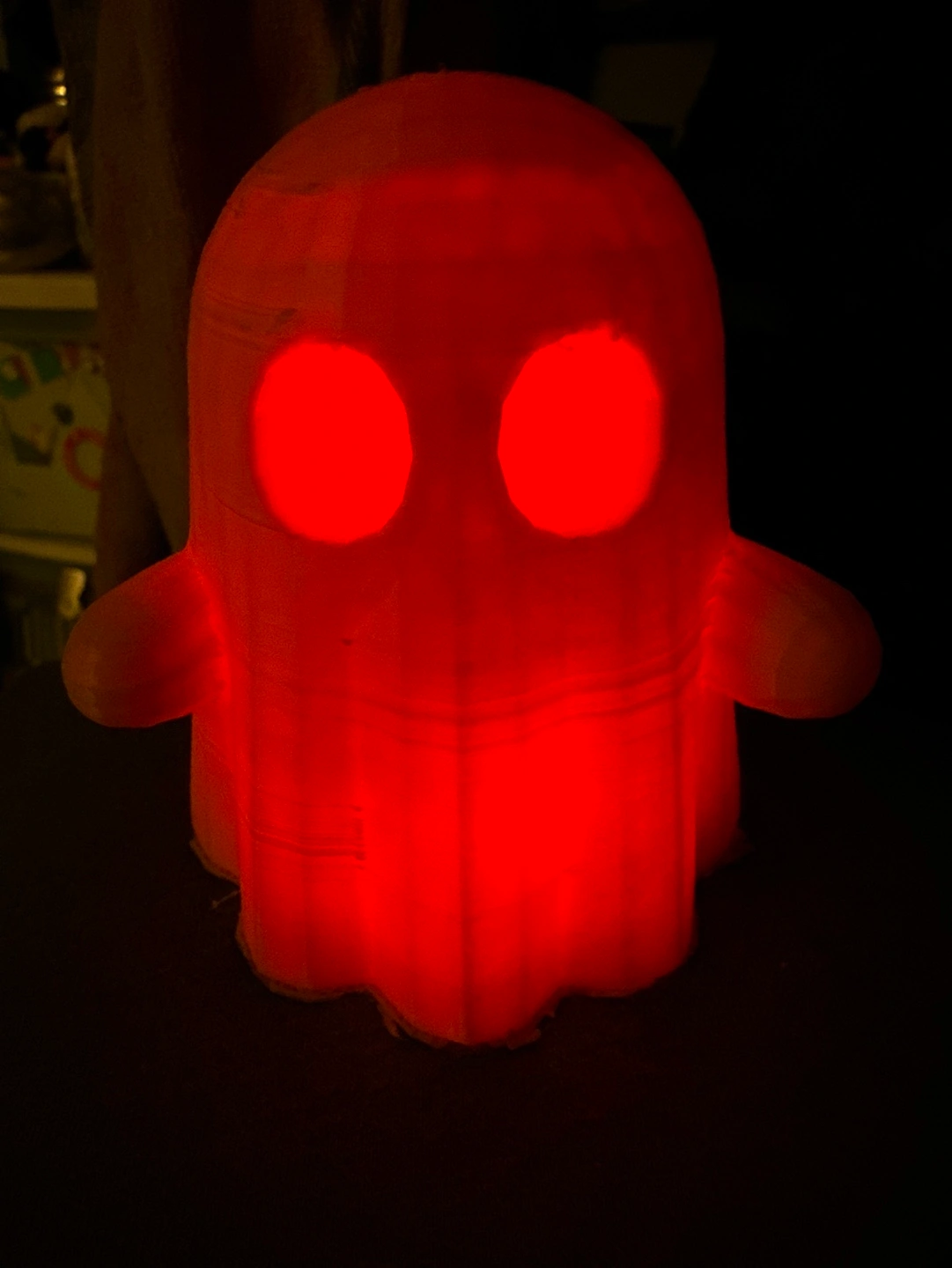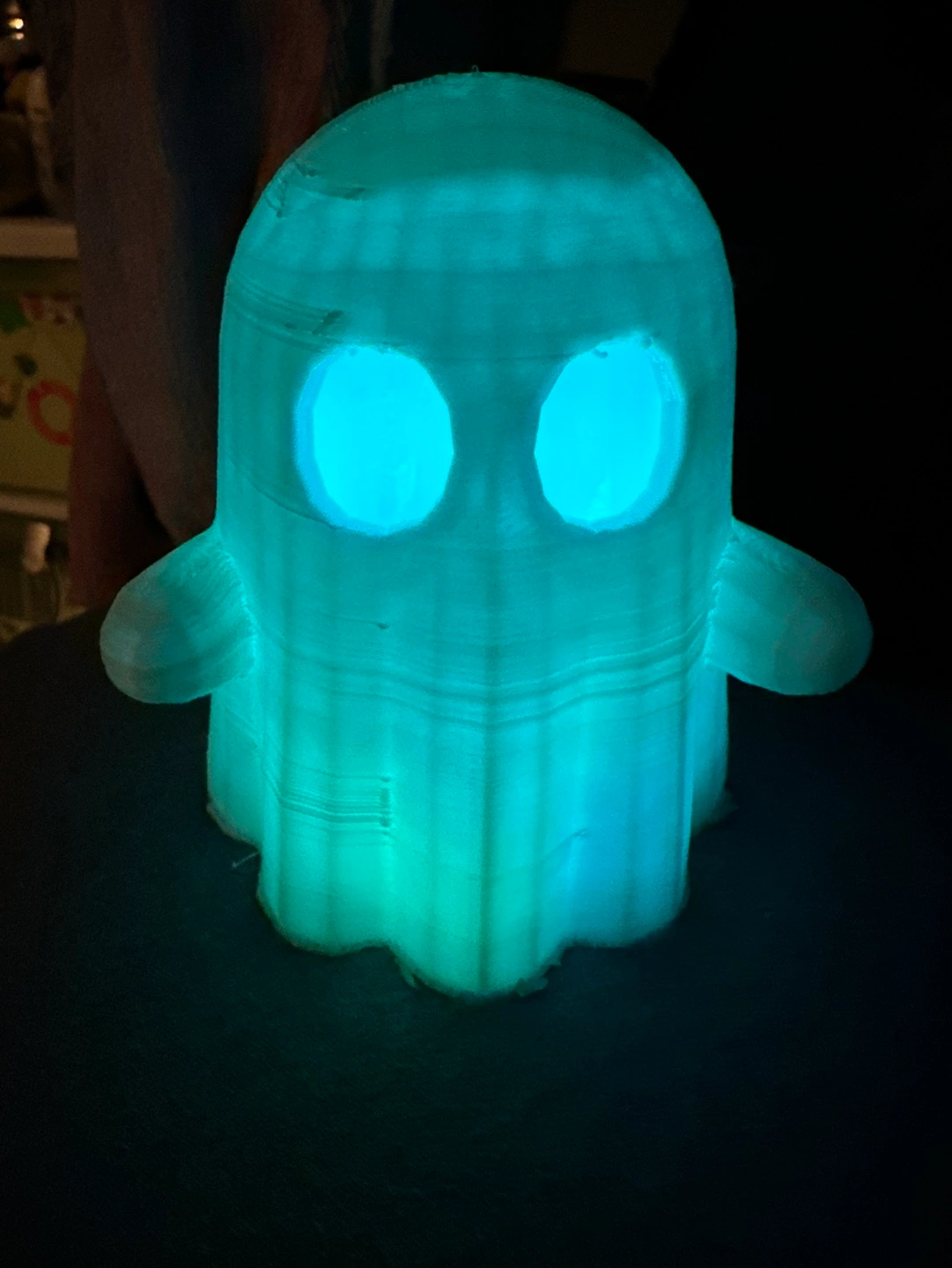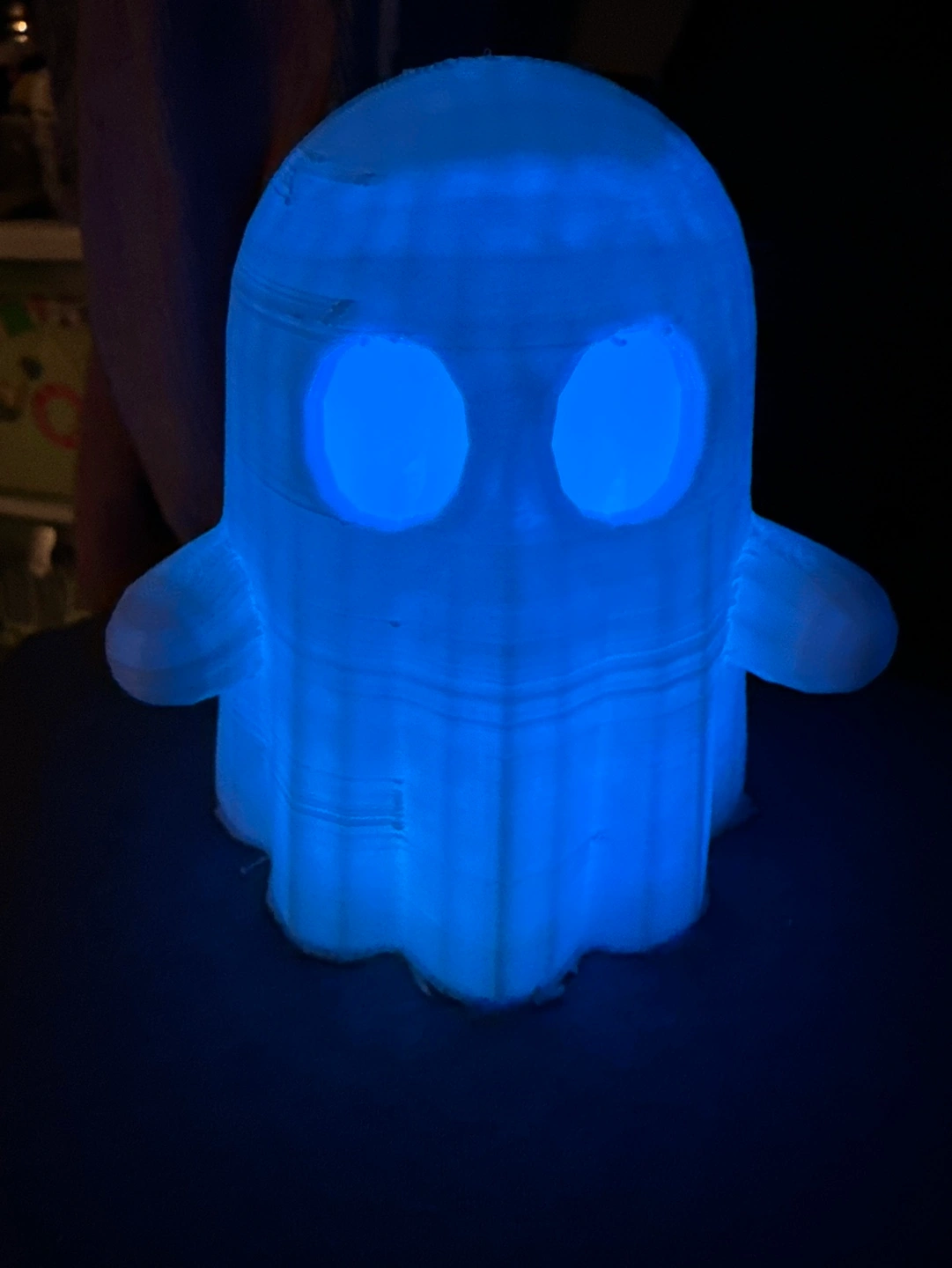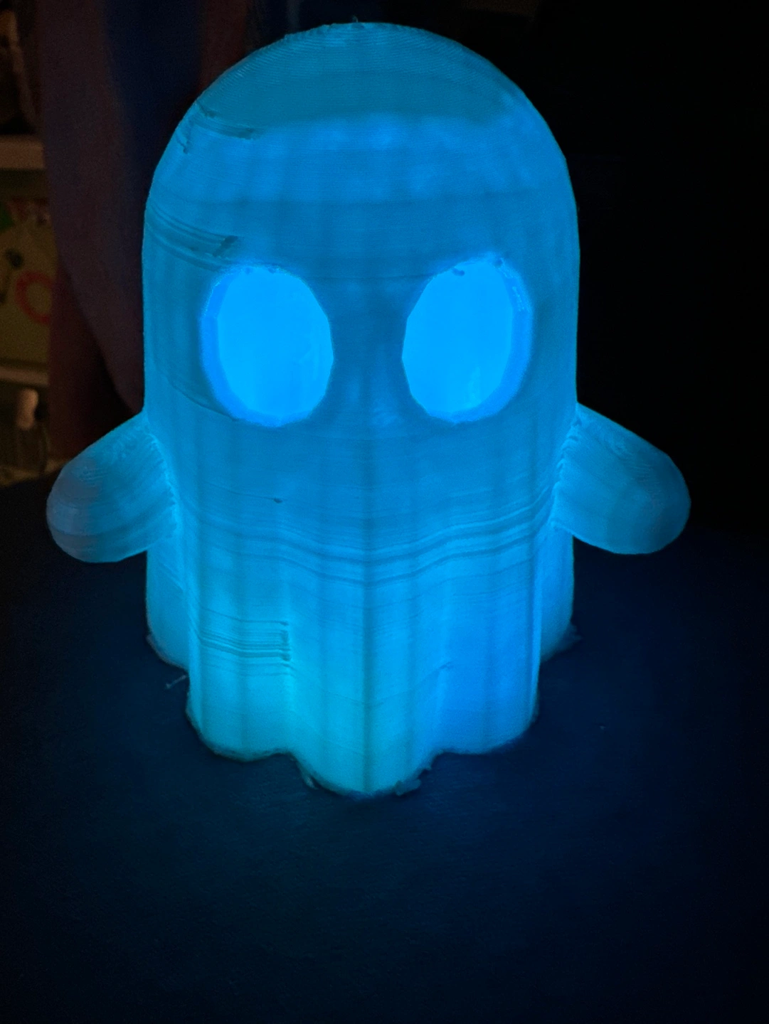 653D printed ghost with colour changing LED lights. Can be used for Halloween decorations or as a nightlight.