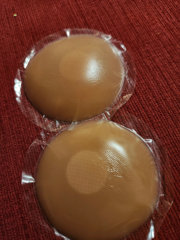 Set of 7 reusable silicone adhesive nipple covers. Brown in color. For use with backless, strapless, and low-cut tops and dresses.