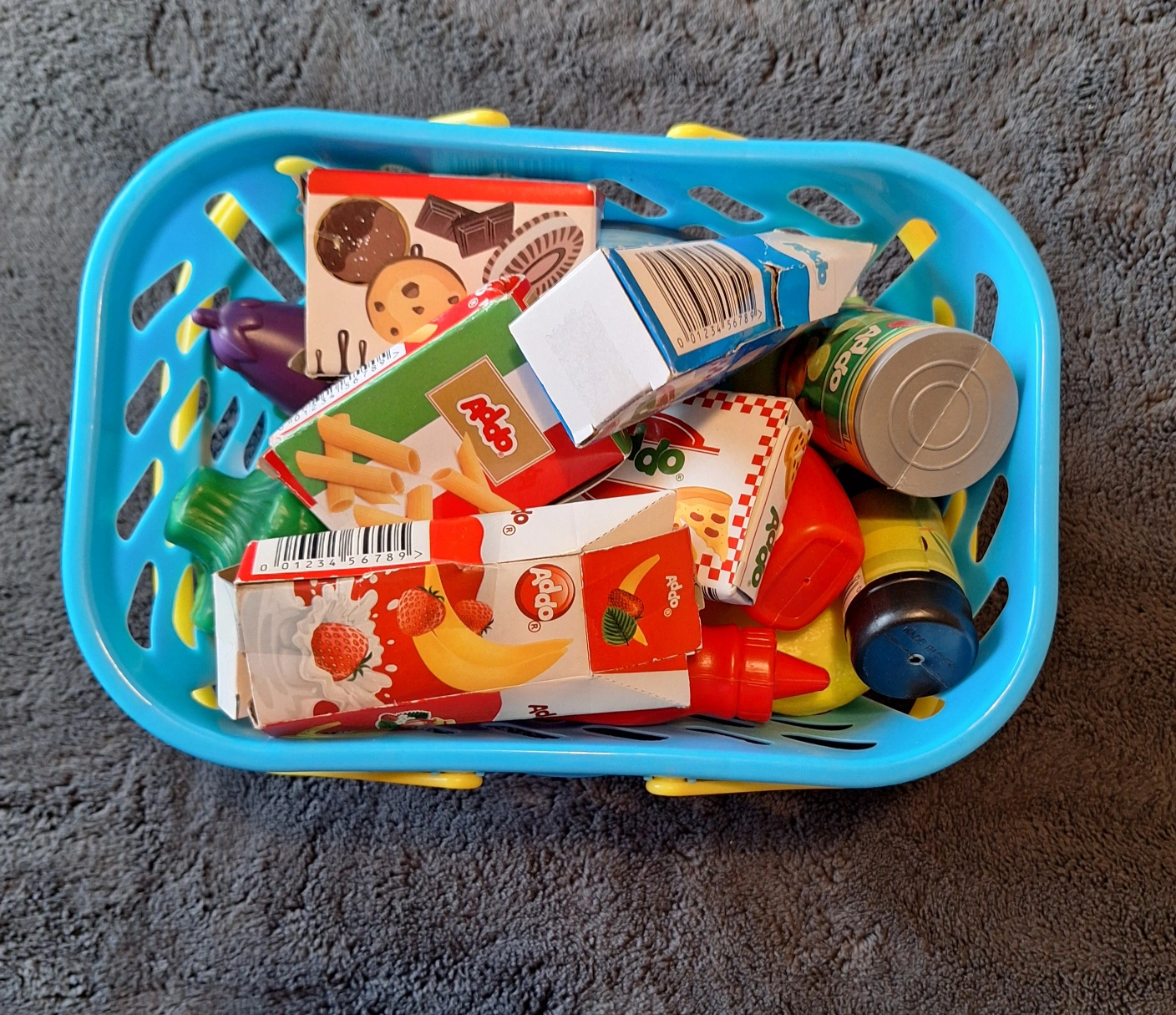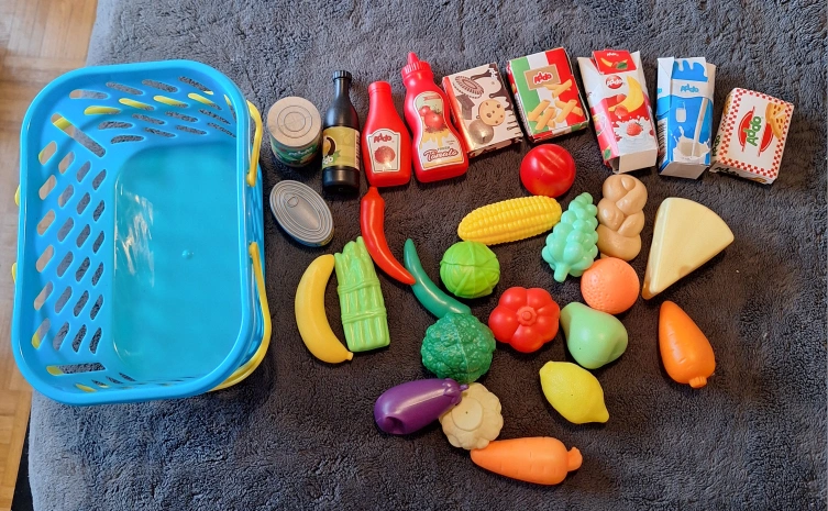 527Play food set with basket. Includes various fruits, vegetables, and packaged food. Suitable for children. Pick up Keele and Lawrence. Check out my other ads for more food, dishes, grocery basket, kitchen appliances and a play kitchen.***