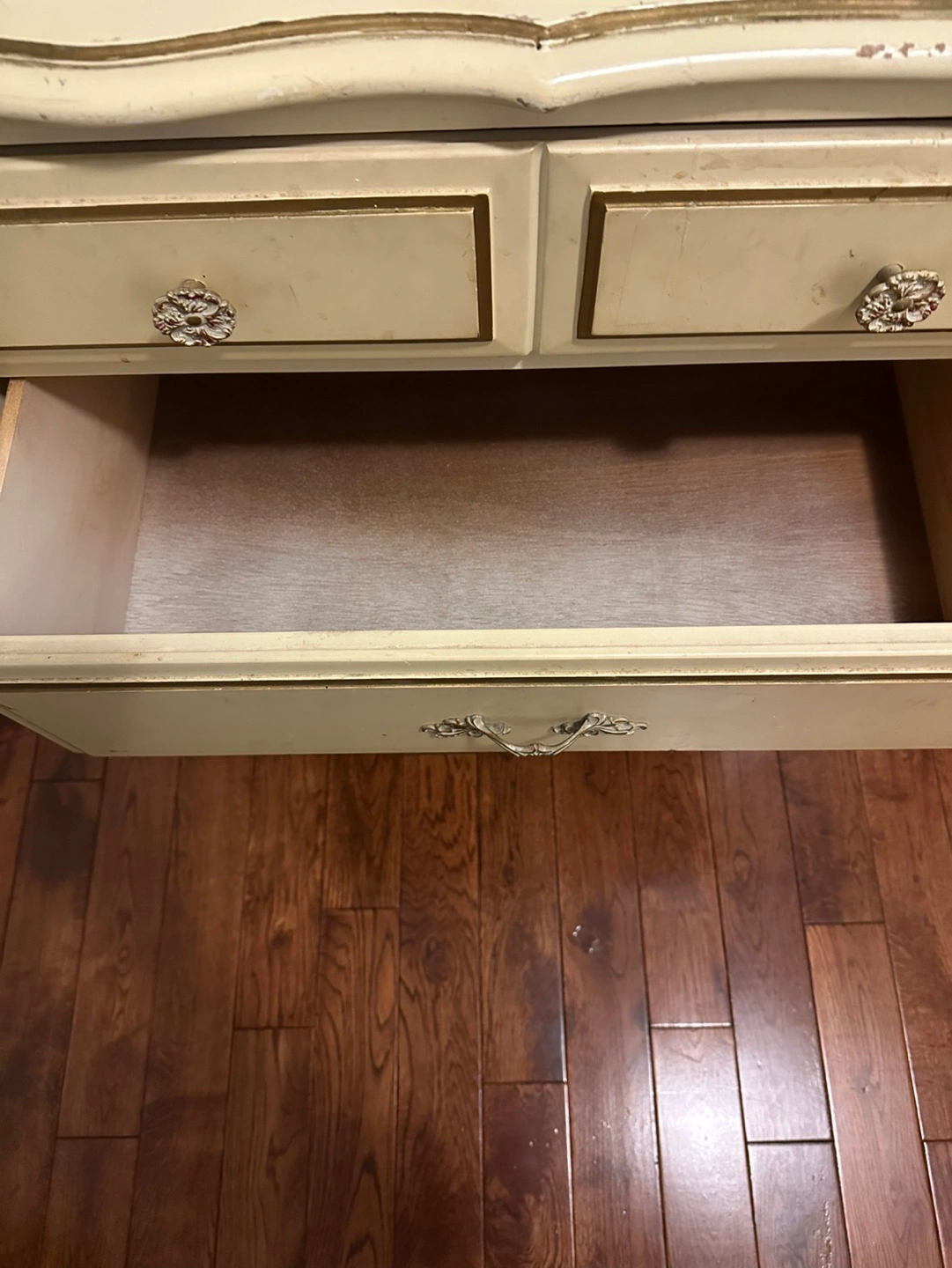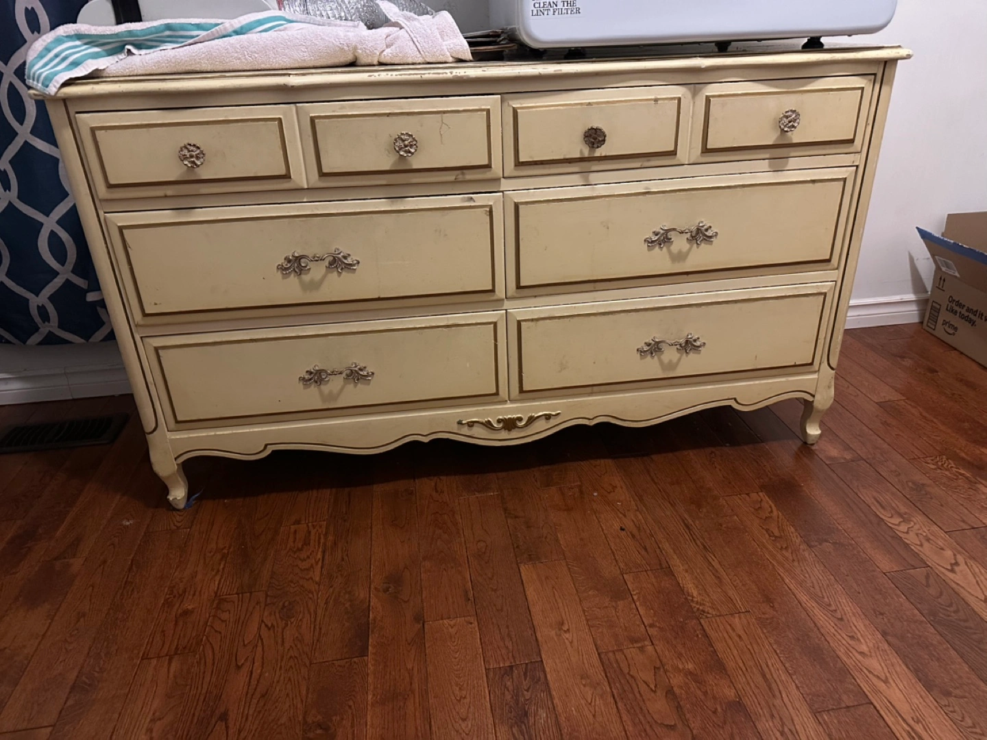 Free sturdy vintage six drawer dresser with intricate carvings and decorative hardware. Some minor wear and tear. Includes one matching nightstand in fair condition (shown in picture) and one in poor condition.
