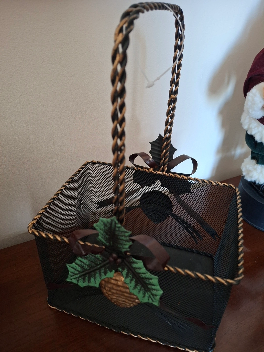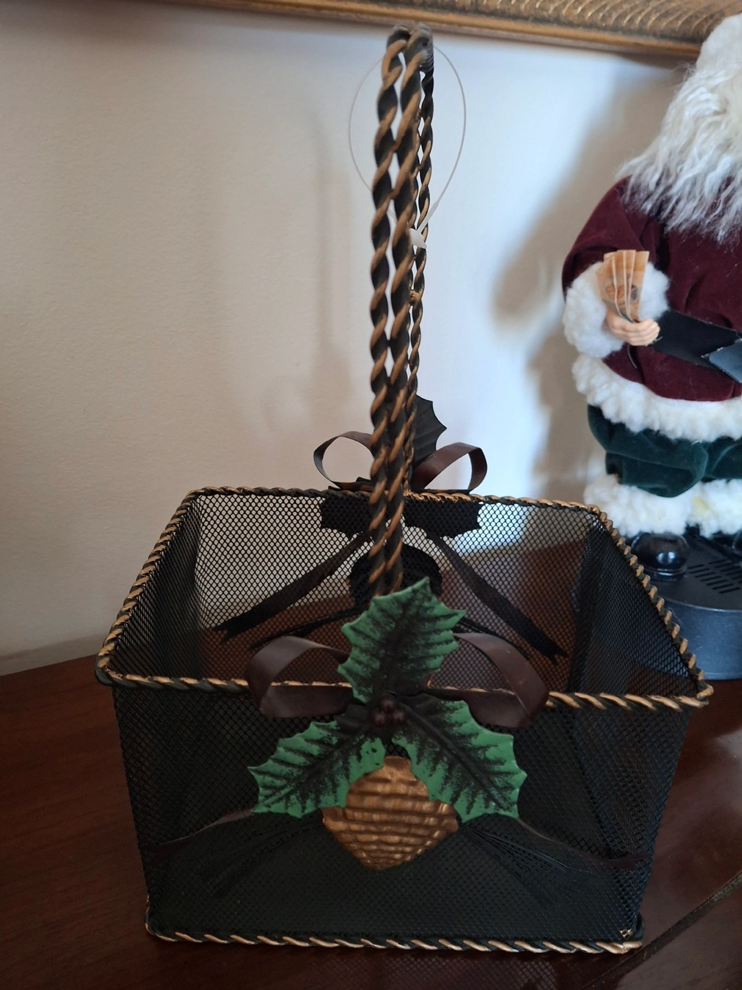 1000+Winter metal basket, green with gold twisted handle. 6.75” x 4.5” and 11” tall top of handle. Excellent condition, plastic tag still on. Available for pickup in Markland Wood.