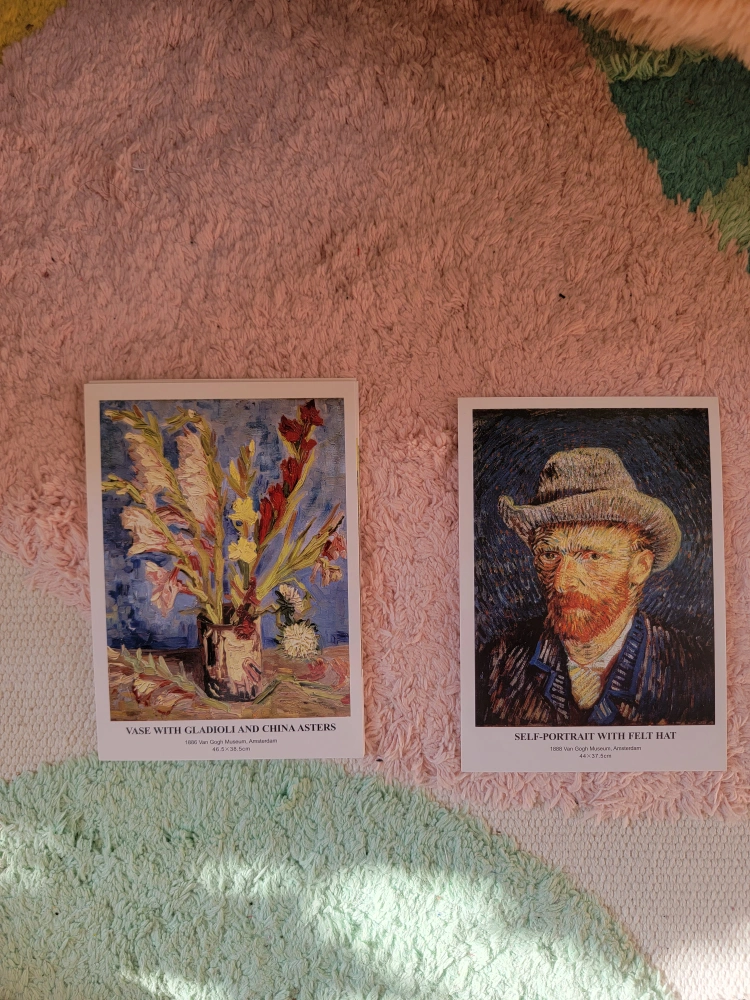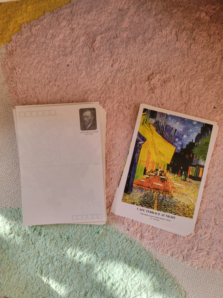 1000+Set of Van Gogh postcards. Includes famous paintings like Sunflowers, Cafe Terrace at Night, Vase with Gladioli and China Asters, and more. New in box. Total 30 postcards, all unique designs. Some shown in photos. Perfect to gift as well. Size approx 6 x 4 inches