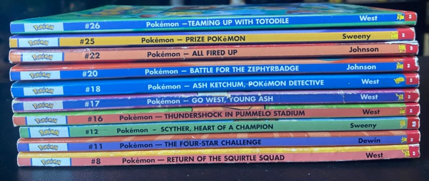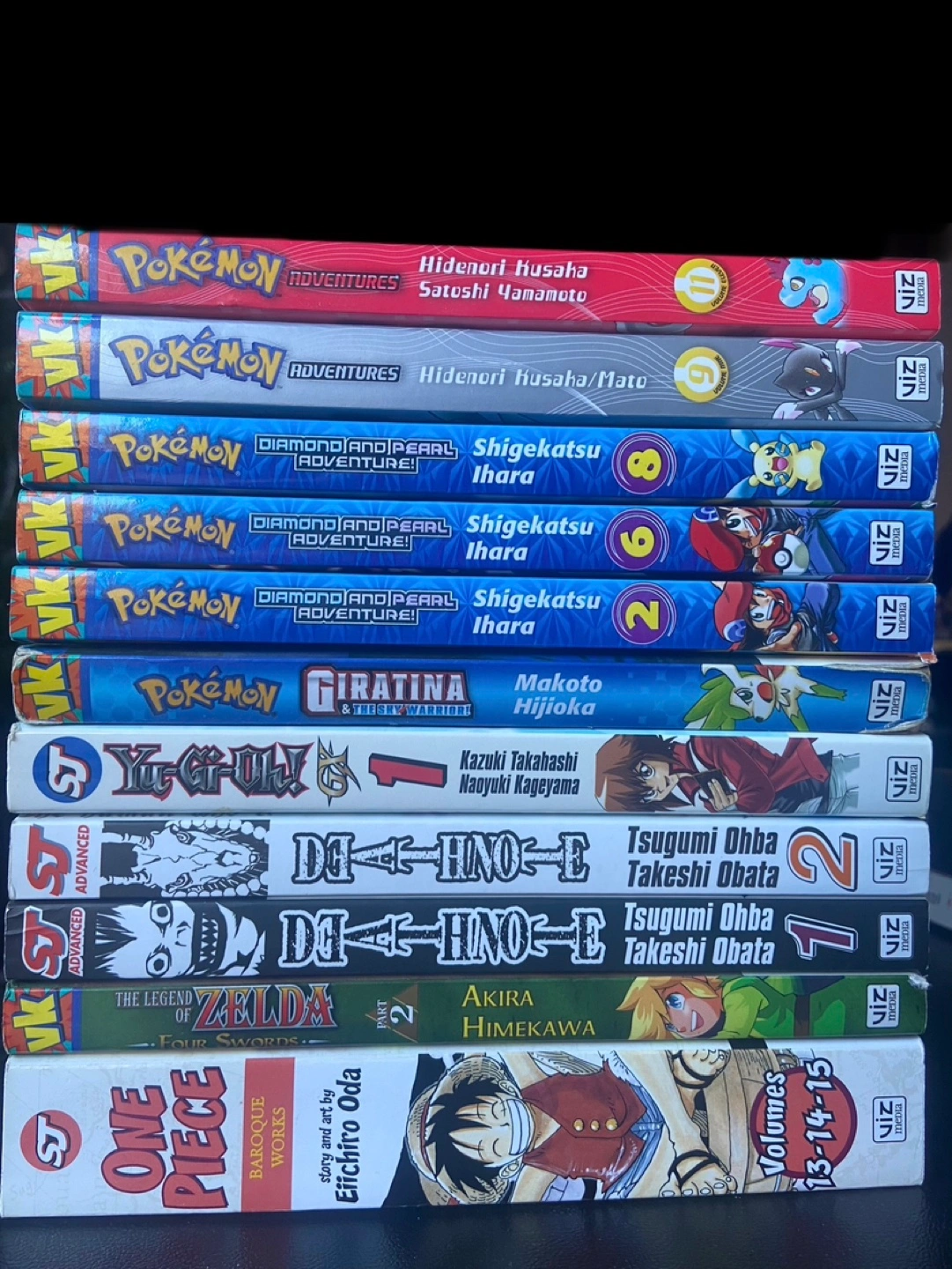 Collection of graphic novels and books. Includes Pokémon, Yu-Gi-Oh!, Dragonball, One Piece, The Hobbit, Jack's Run, Romeo and Juliet, and Hamlet.