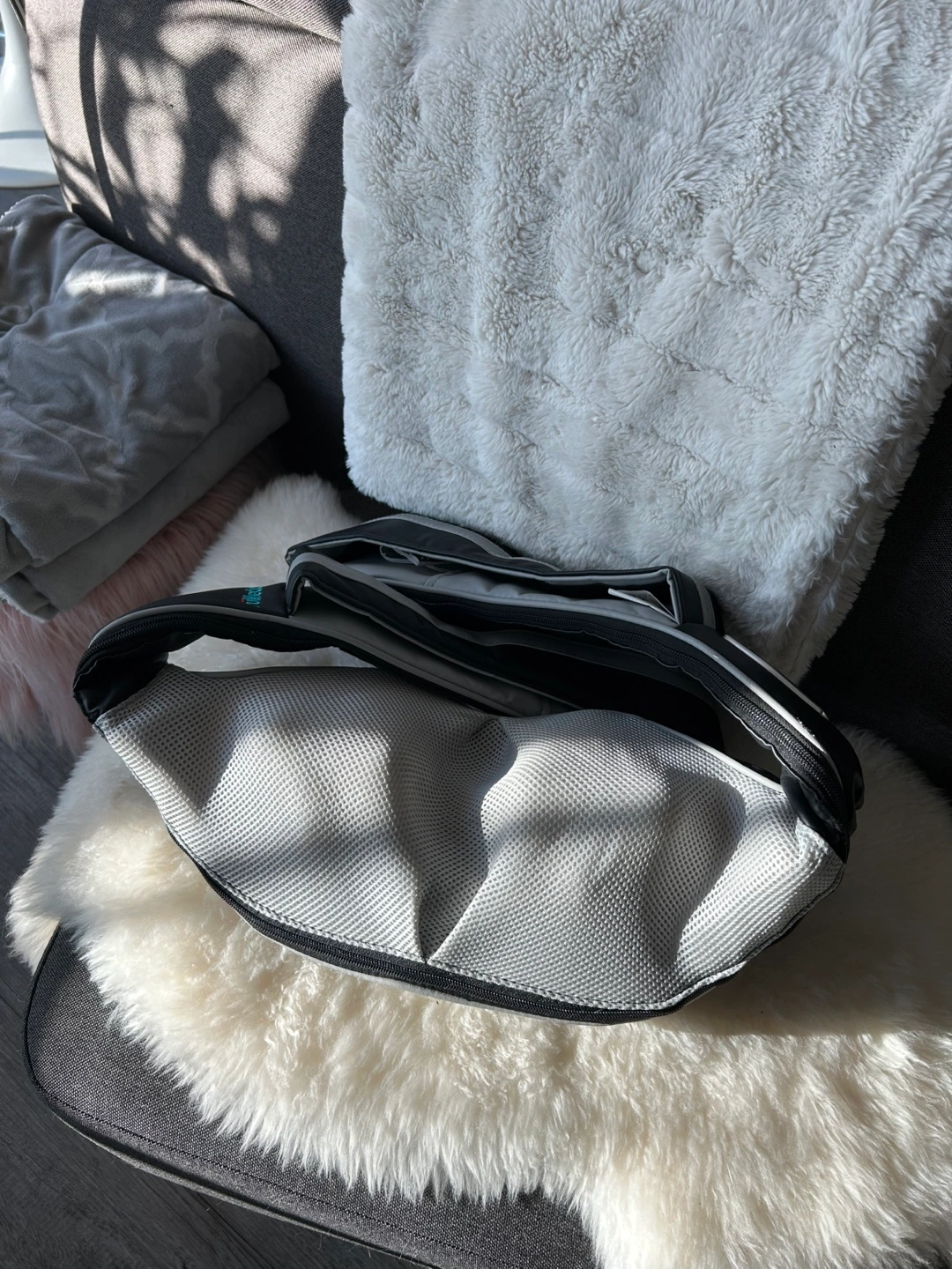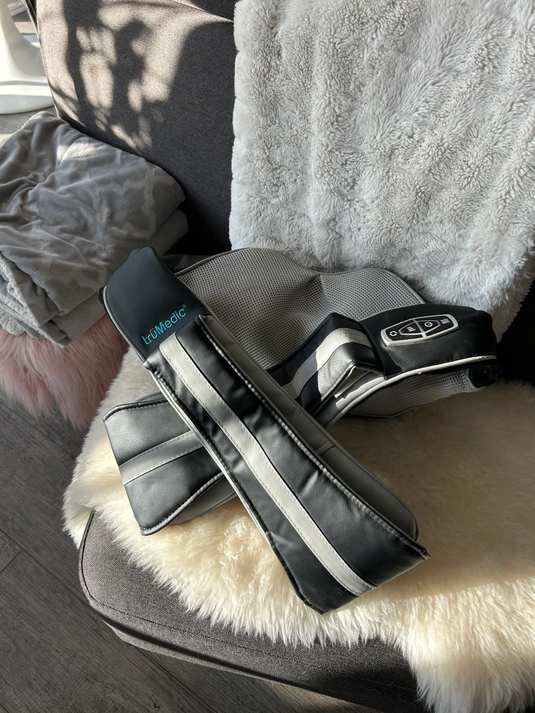 Back massager, rechargeable for cordless use. It offers heat therapy and multiple massage settings for customized relief. The device comes with a power adapter.