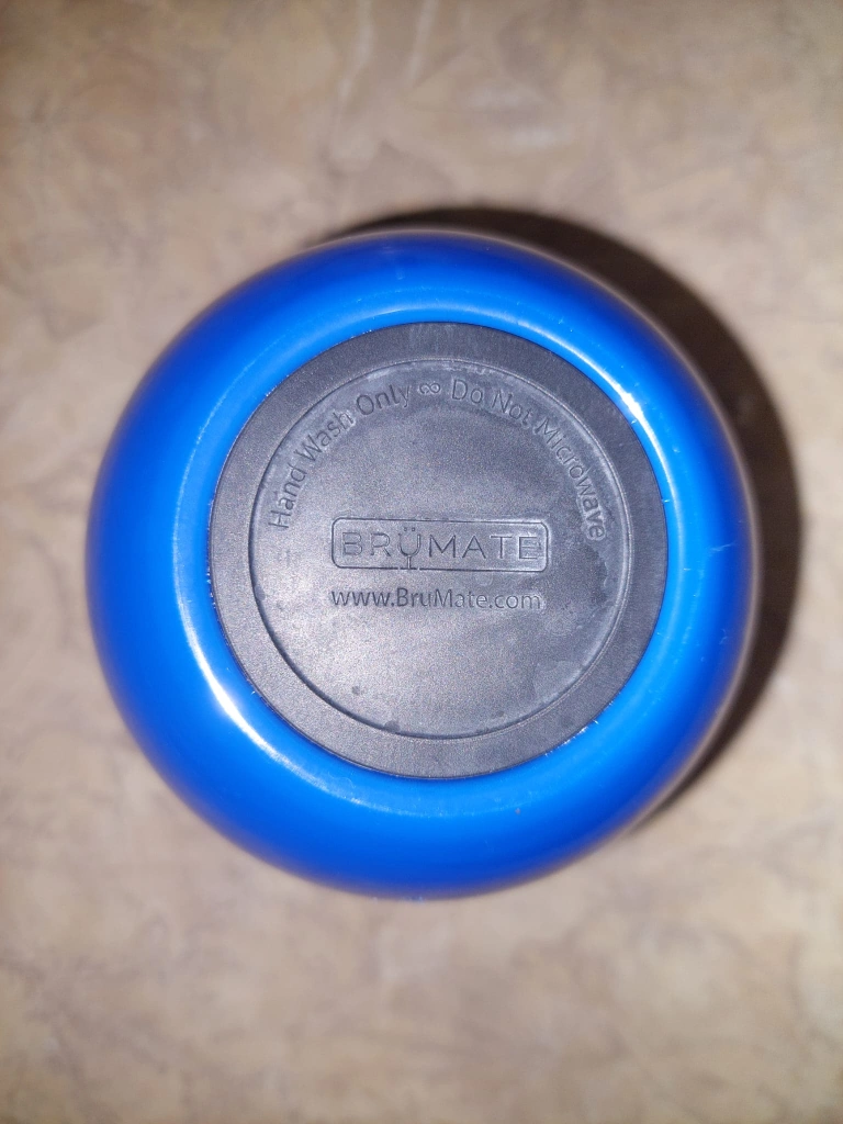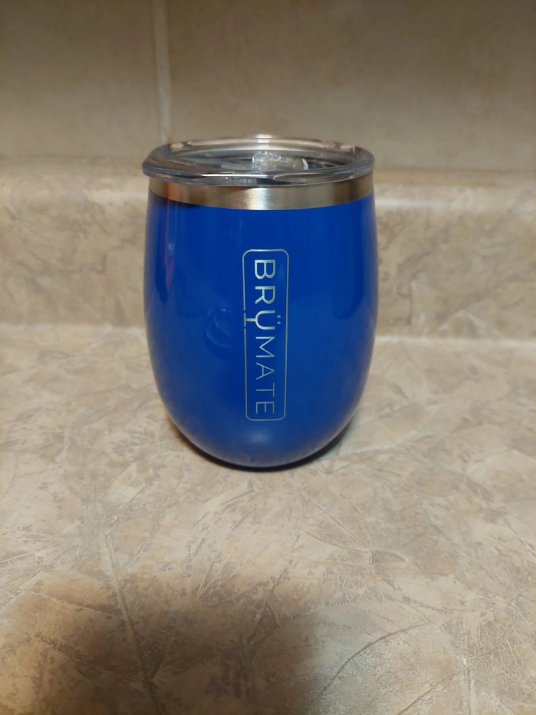 Blue insulated wine tumbler. Keeps drinks cold or hot. Includes a lid.