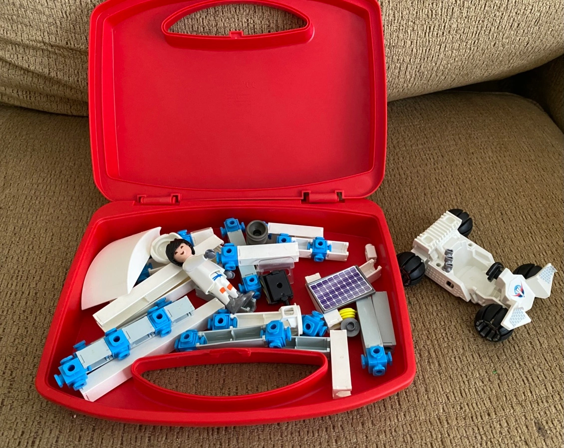K'NEX Playmobile building set, space exploration theme, includes astronaut figure and rover. Comes in original red carrying case.