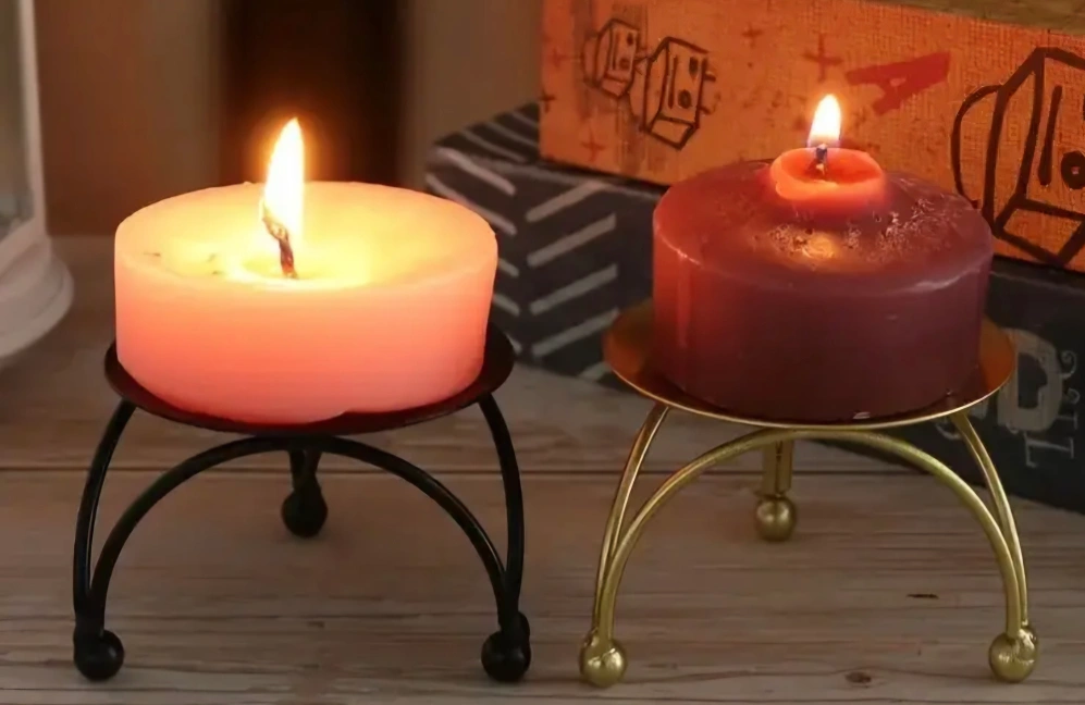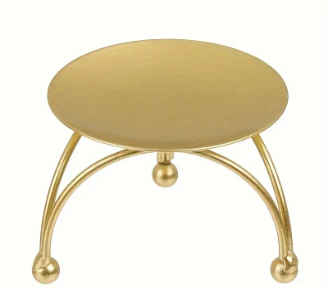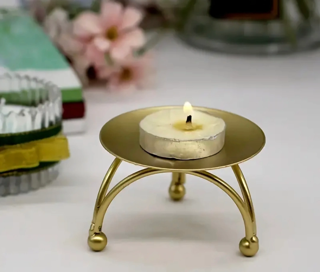 55Metal gold candle holder with a round plate and three legs. Perfect for tea lights or small candles, wedding or home decor