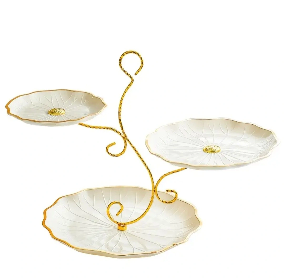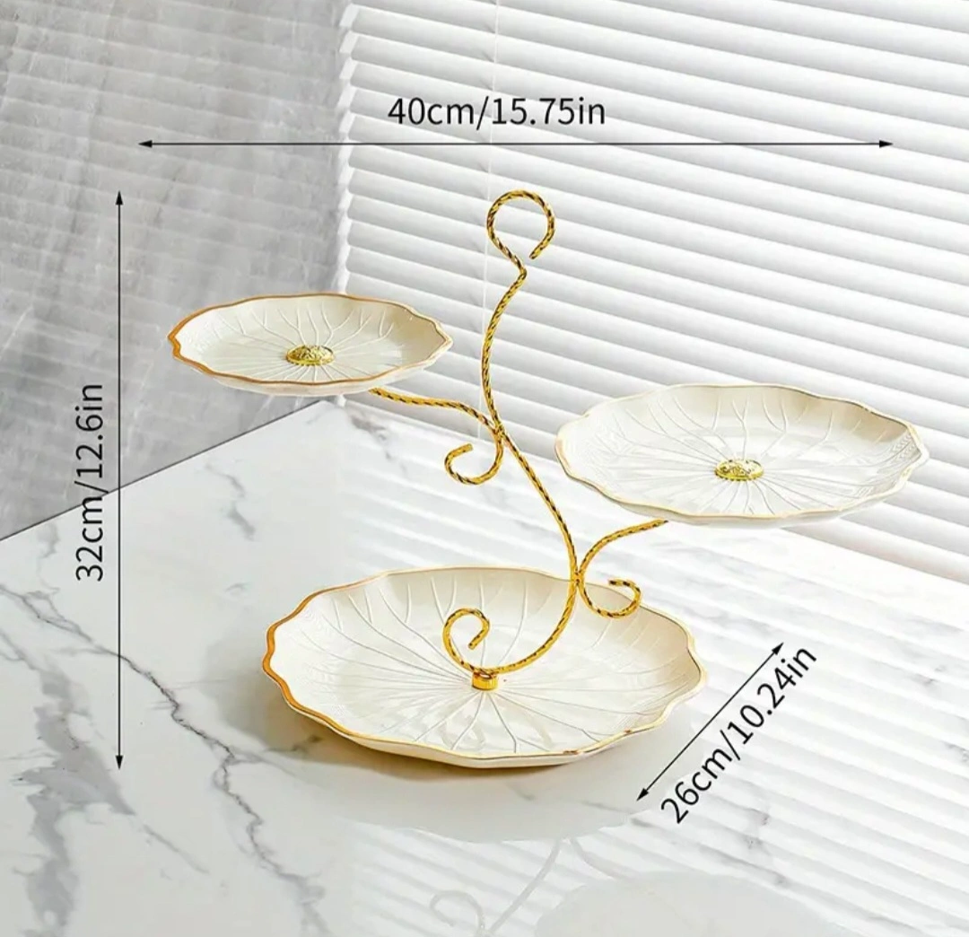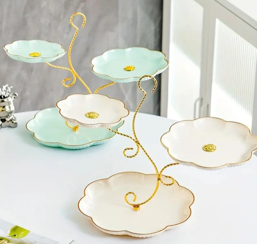 55Three-tier stand with flower-shaped plates. Metal stand and plastic plates