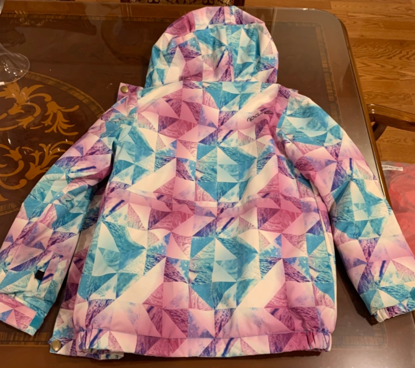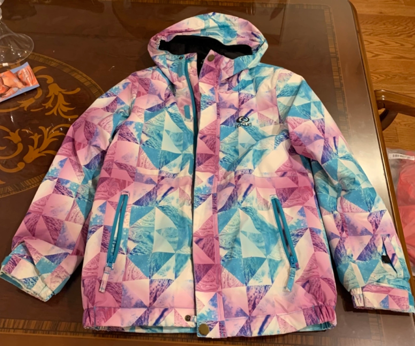 30Geometric print ski jacket. Zipper closure, hood with drawstrings, zippered pockets.