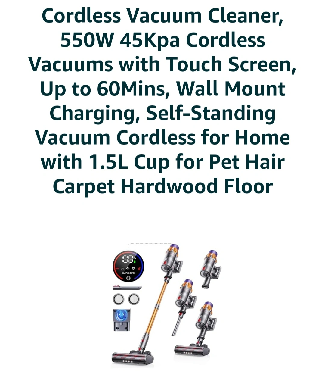 Cordless vacuum cleaner. Up to 60 minutes of run time. Includes wall mount and self-standing features. Comes with a 1.5L cup for pet hair. Great for carpets and hardwood floors.