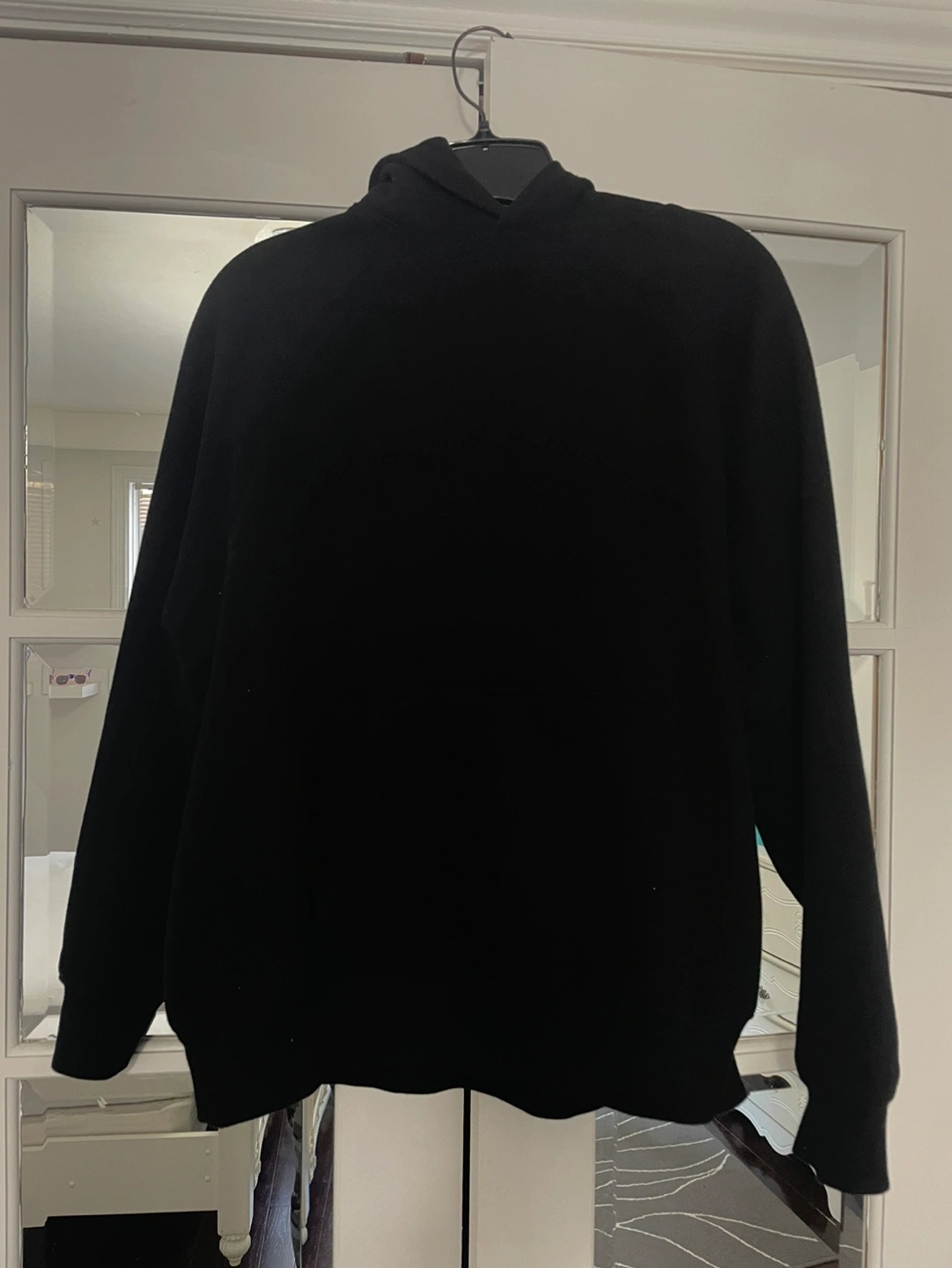 Black hoodie with a relaxed fit. Has a pouch pocket.