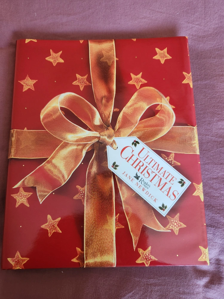 Hardback book with a red cover featuring gold stars. The book features recipes, decorating ideas, and more. Published in the United Kingdom.