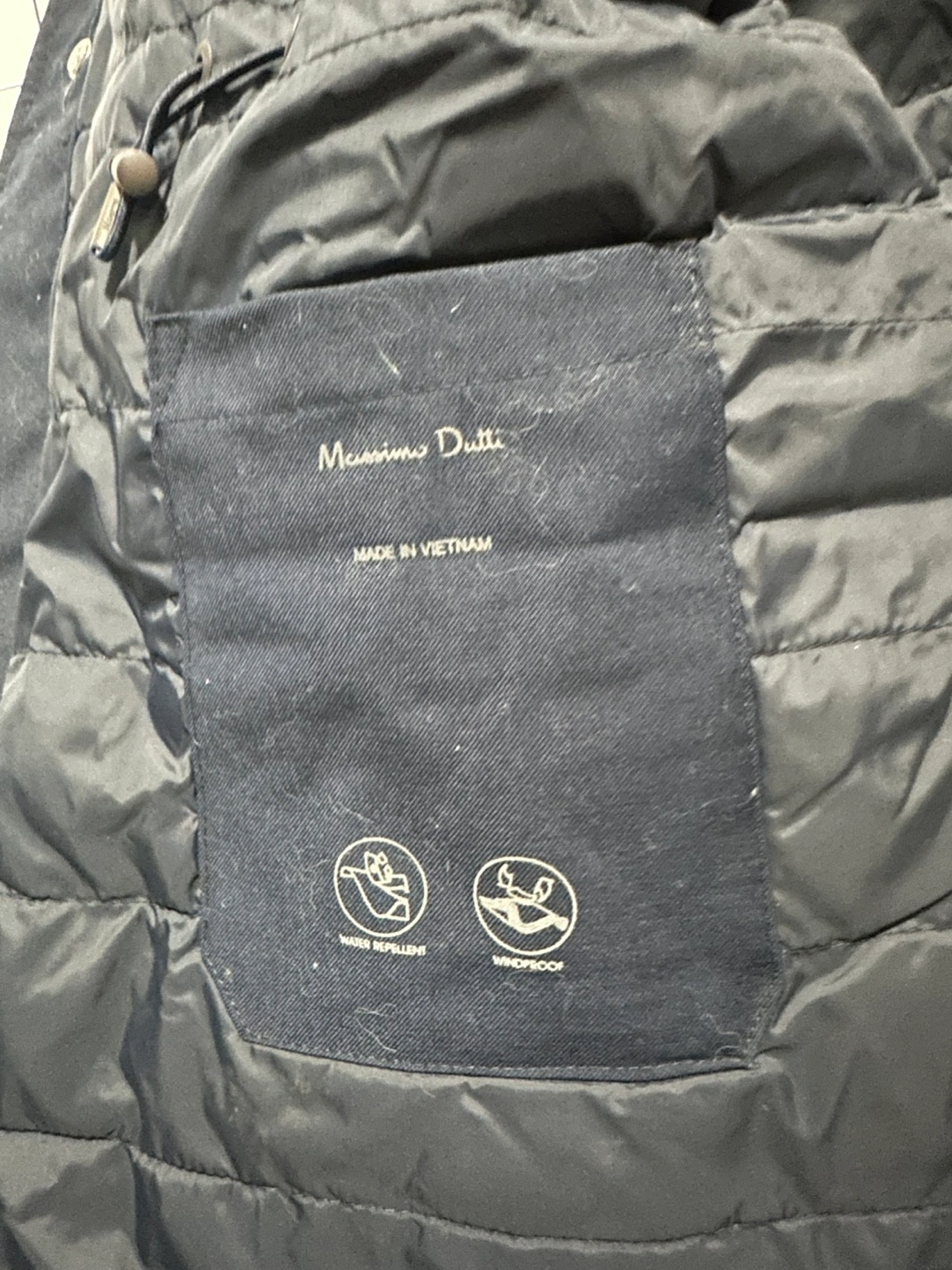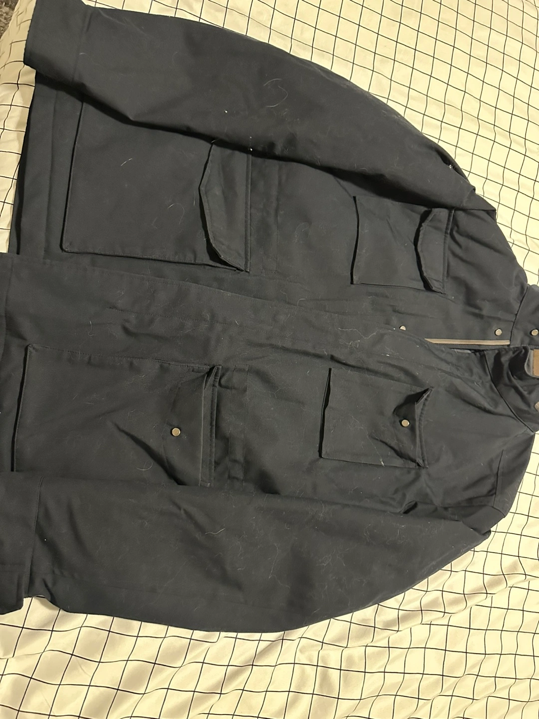 Blue navy jacket. Water repellent and windproof. Has multiple pockets and a hoodie inside the zipper.