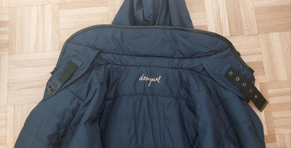 42Dark blue winter jacket with a hood and floral embroidery. Size 38.