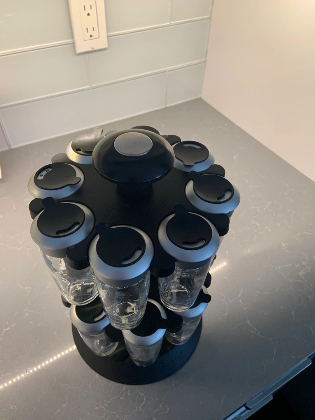 Buy & SellSpice Rack CarouselSpice Rack CarouselFreeRotating spice rack with 16 glass jars and black lids. Perfect for organizing spices and saving counter space.WHERE TO MEETCheck LocationView MapSELLERAllison RHurontario908 reviews2 chats·1 favorites·55 views