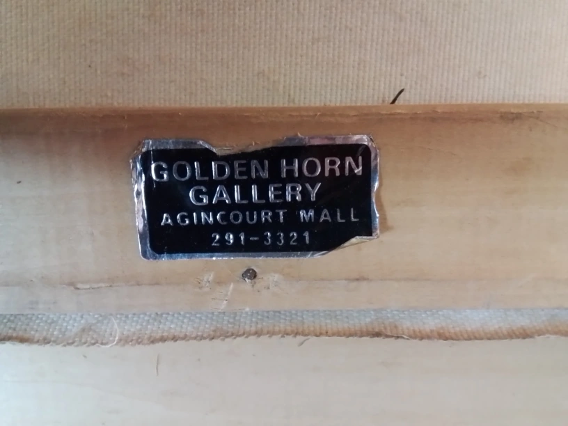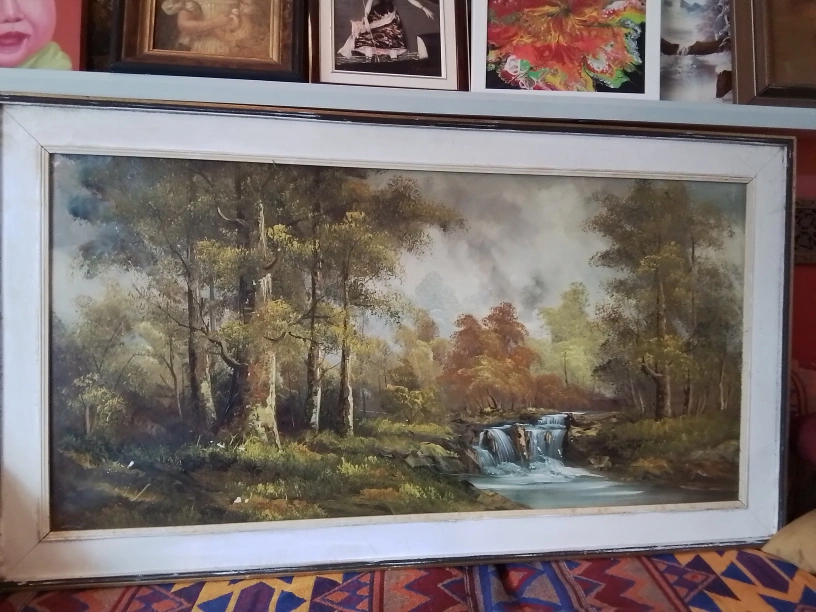 114Large Framed Waterfall Oil Painting Framed oil painting of a waterfall in a forest setting. The painting is in good condition with minor signs of wear. Size is approx 48 x 26". In used condition, as is, Pickup at Young Street and Steels Ave