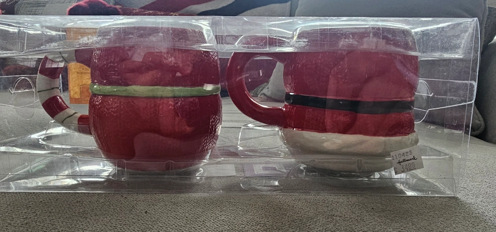Set of two ceramic mugs. One features Santa Claus and the other Mrs Claus. New in box.