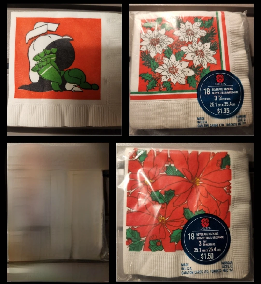 All new - I have 10 packs of each design (2 variations of poinsettia and 1 of penguine design). 30 packs in total. $.50 per pack or we can do a deal for 10 or more packs. Pick up only please unless you want the lot (we can negotiate price if you want the lot)View my other listing and we can look at package deals - get a bargain.