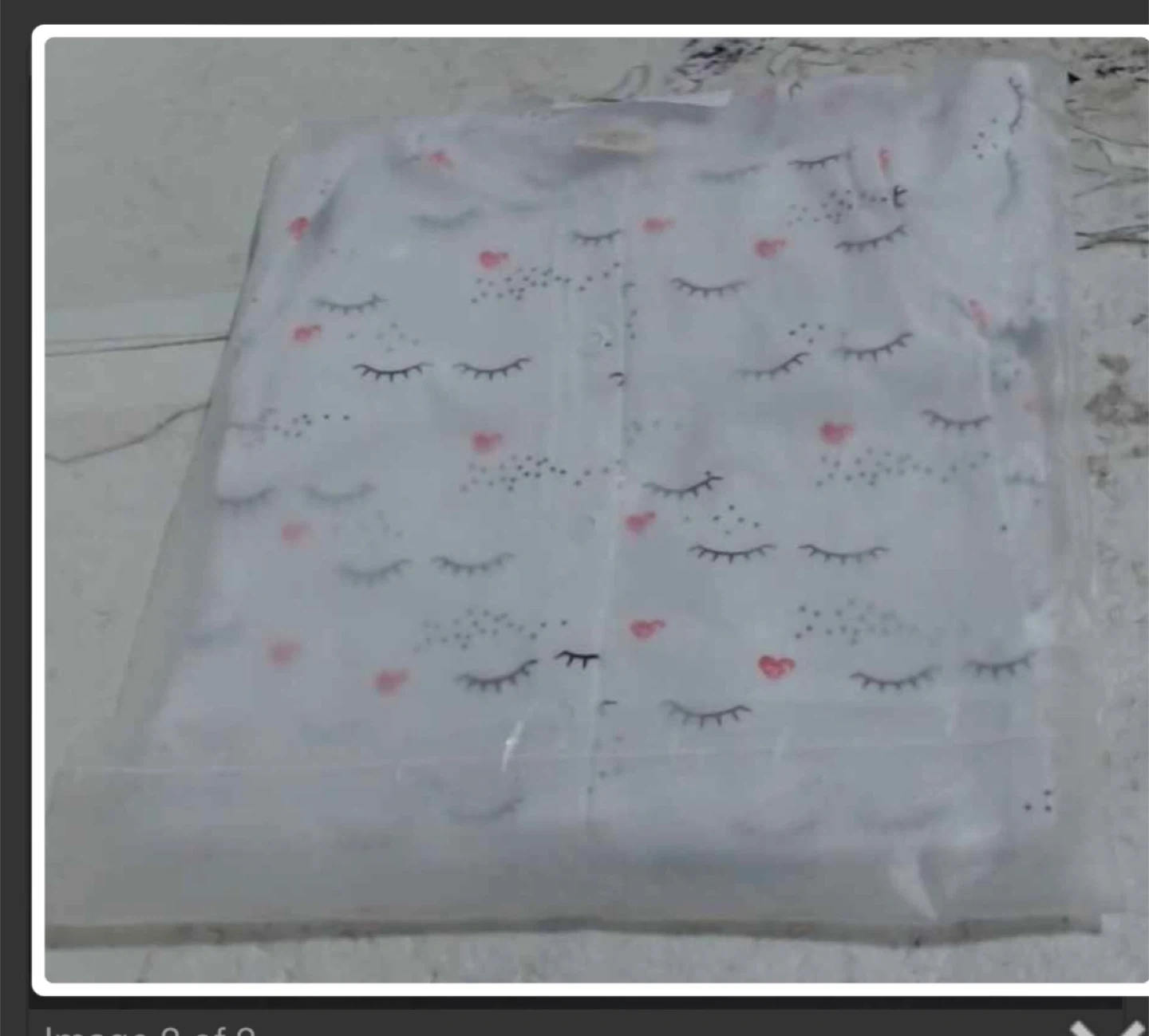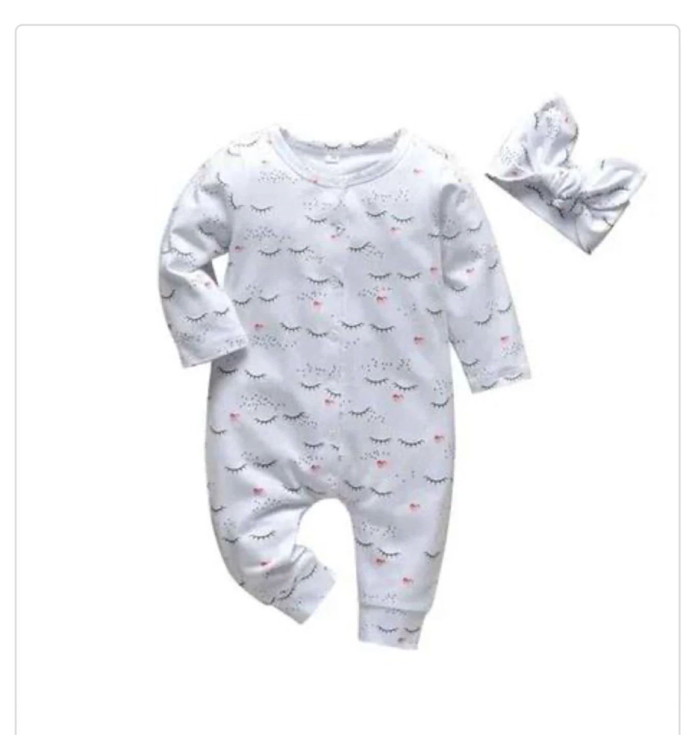 White long-sleeved sleepsuit and matching headband for babies. Features a cute sleepy eye and heart print. Made from soft material for comfort. Perfect for newborns and infants!
