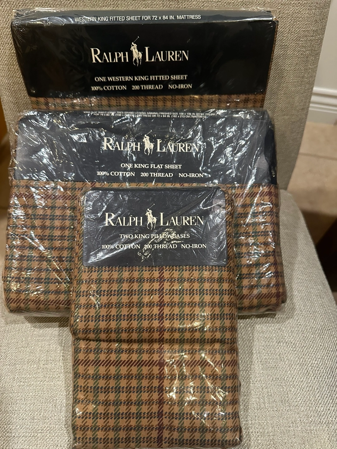 California King size sheet set, includes fitted sheet, flat sheet, and two pillowcases. 100% cotton, 200 thread count, no-iron. Plaid pattern in brown, tan, and white. OBO