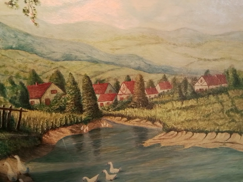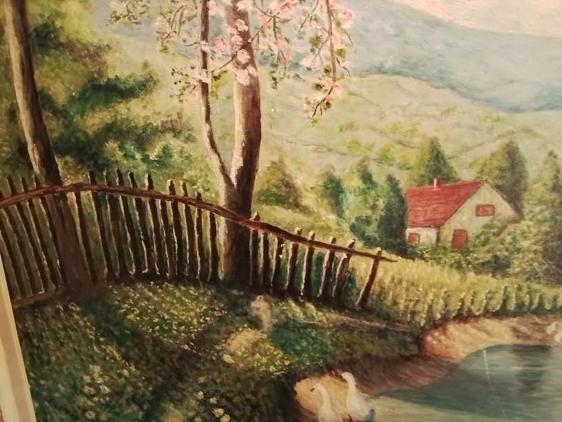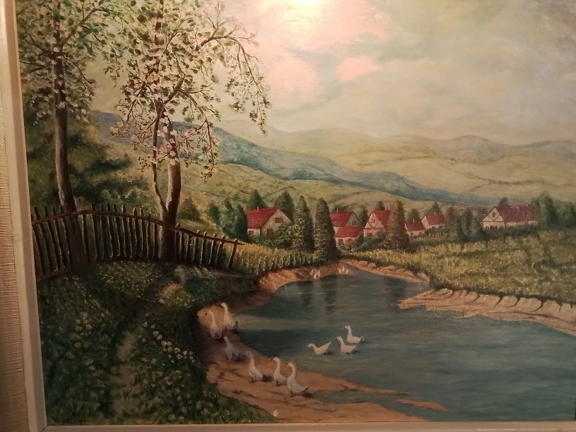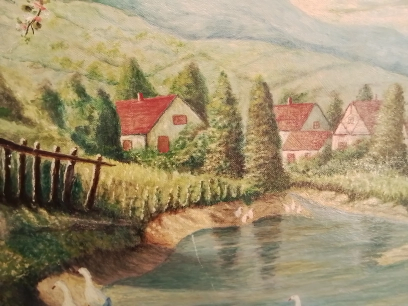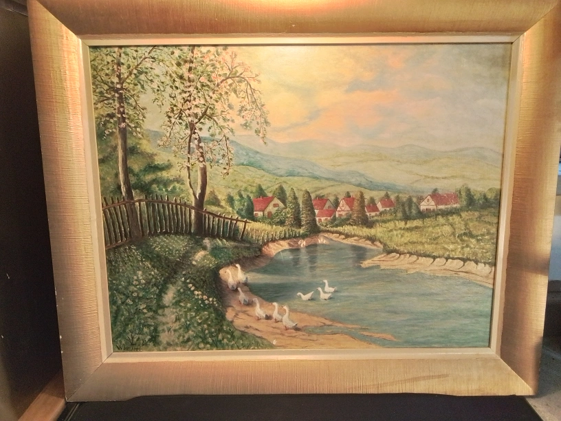 Oil painting on canvas, depicts a village landscape with a stream and geese. Framed in a gold-tone frame.