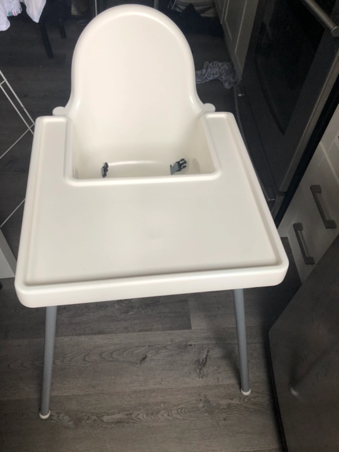 White high chair with tray. Used, but still in good condition. Fine scratches on tray which are hardly visible as shown in third picture